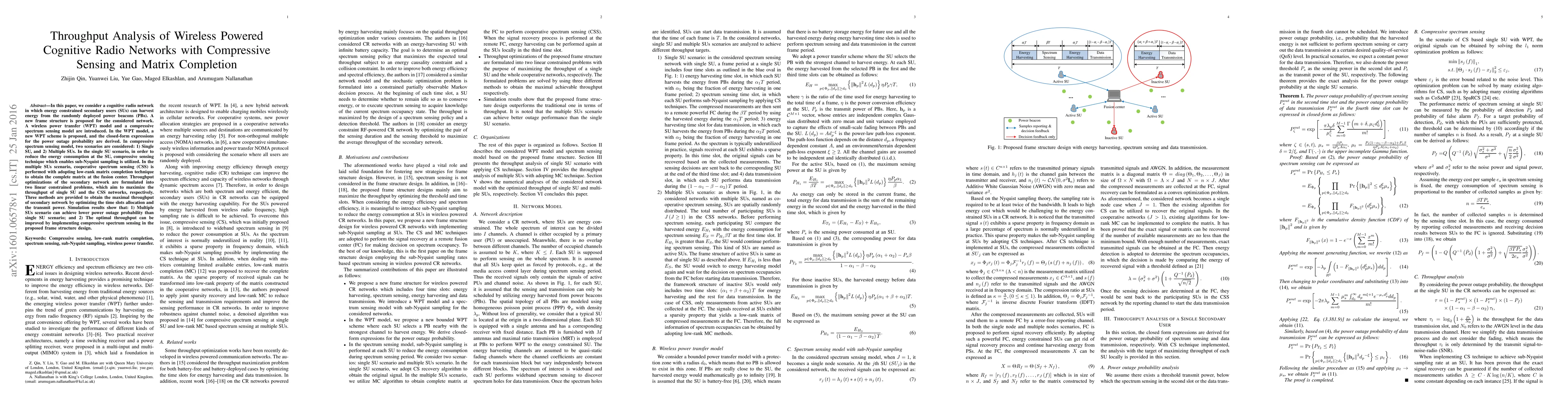 This paper analyzes the throughput of wireless powered cognitive radio networks using compressive sensing and matrix completion. It proposes a new frame structure, wireless power transfer scheme, and compressive spectrum sensing models, optimizing throughput for single and multiple secondary users through time slot and power allocation.