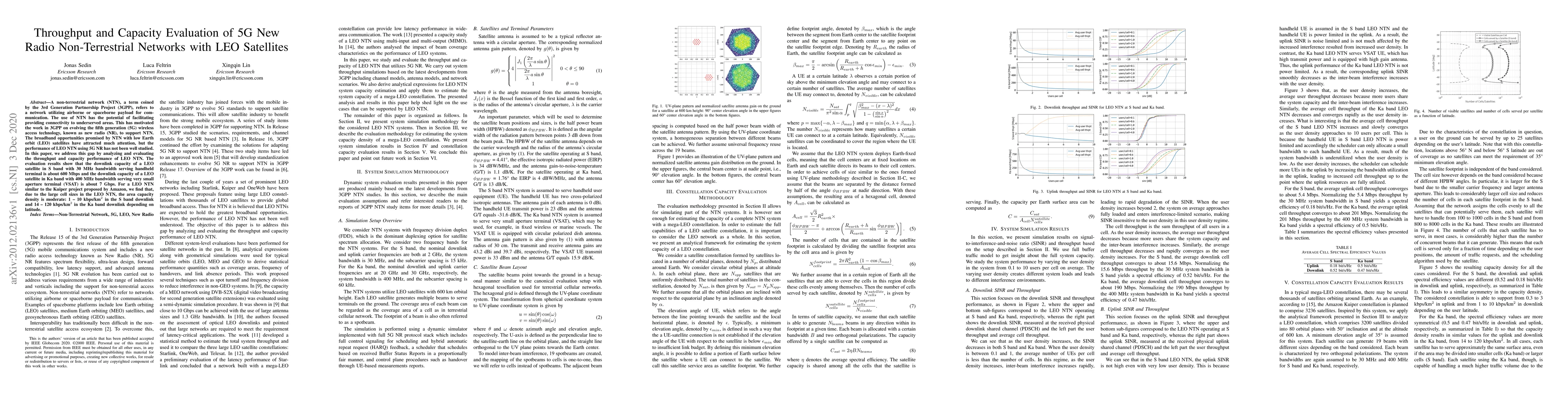 This paper evaluates the throughput and capacity of 5G New Radio (NR) in Low Earth Orbit (LEO) satellite non-terrestrial networks, finding that downlink capacities range from 600 Mbps to 7 Gbps, with moderate area capacity densities of 1-10 kbps/km² in the S band and 14-120 kbps/km² in the Ka band.