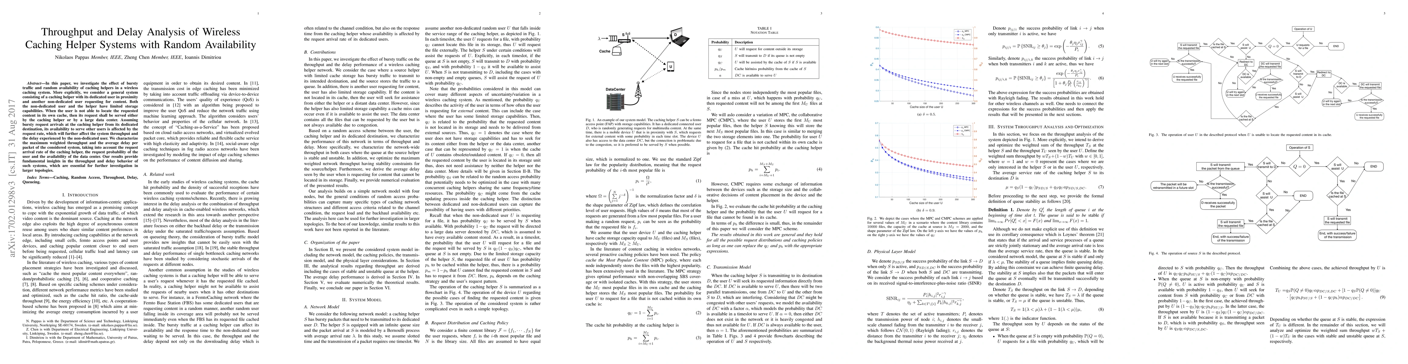 This paper analyzes the throughput and delay in wireless caching systems where caching helpers have random availability due to bursty traffic. It characterizes maximum weighted throughput and average delay, considering factors like request arrival rates and data center availability, offering insights for future studies in larger network topologies.