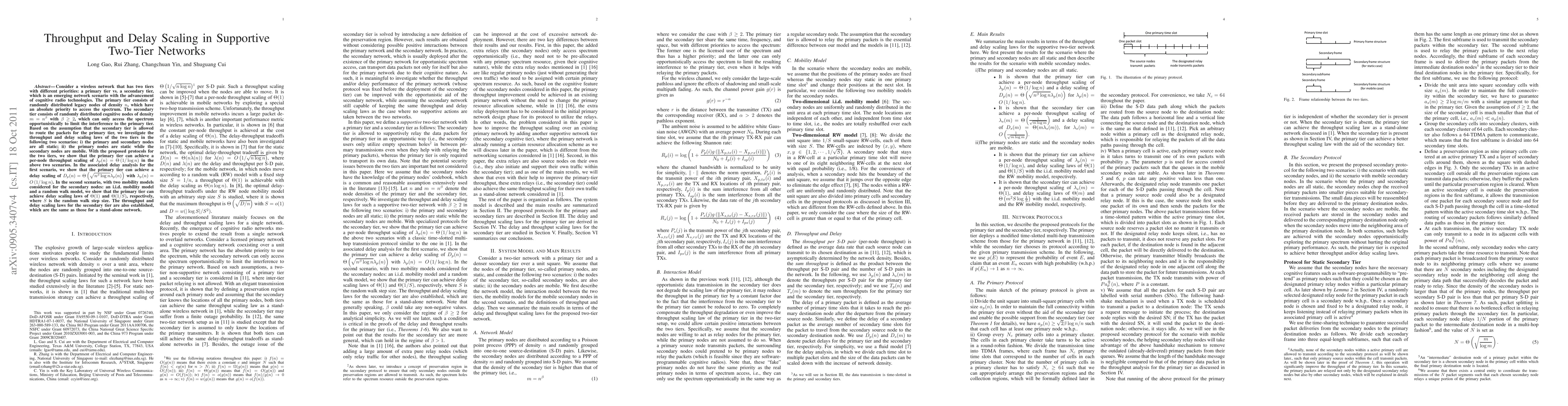 This paper investigates throughput and delay scaling in a two-tier wireless network with primary and secondary nodes, where primary nodes have absolute priority. It demonstrates that the primary tier can achieve $\Theta(1/\log n)$ per-node throughput scaling and delay scaling laws of $\Theta(\sqrt{n^\beta\log n})$ in static scenarios and $\Theta(1)$ or $\Theta(1/S)$ in mobile scenarios, depending on the secondary nodes' mobility model.