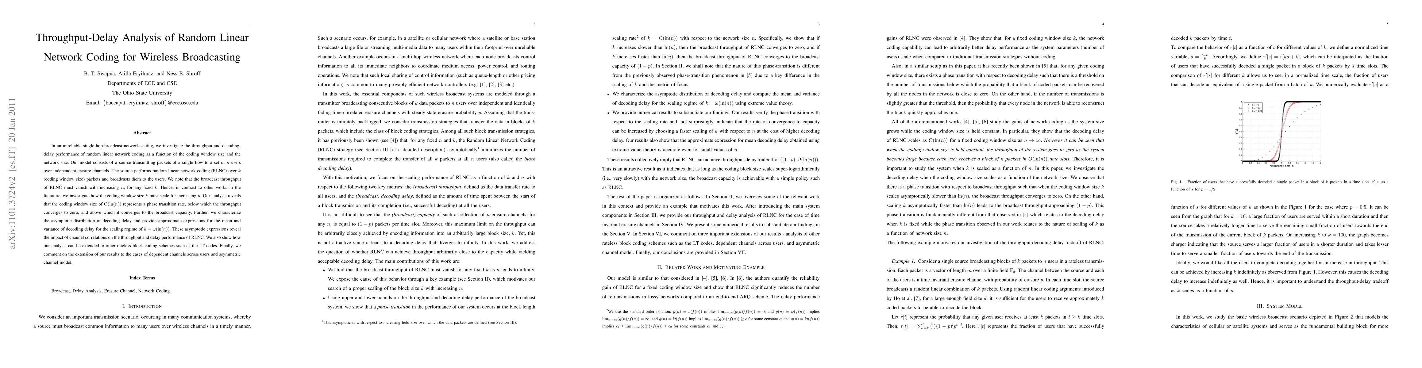 This paper analyzes the throughput and decoding-delay performance of random linear network coding (RLNC) in wireless broadcasting networks, finding that a coding window size of $\Theta(\ln(n))$ optimizes throughput. It also characterizes the asymptotic decoding delay distribution and extends the analysis to other rateless coding schemes.
