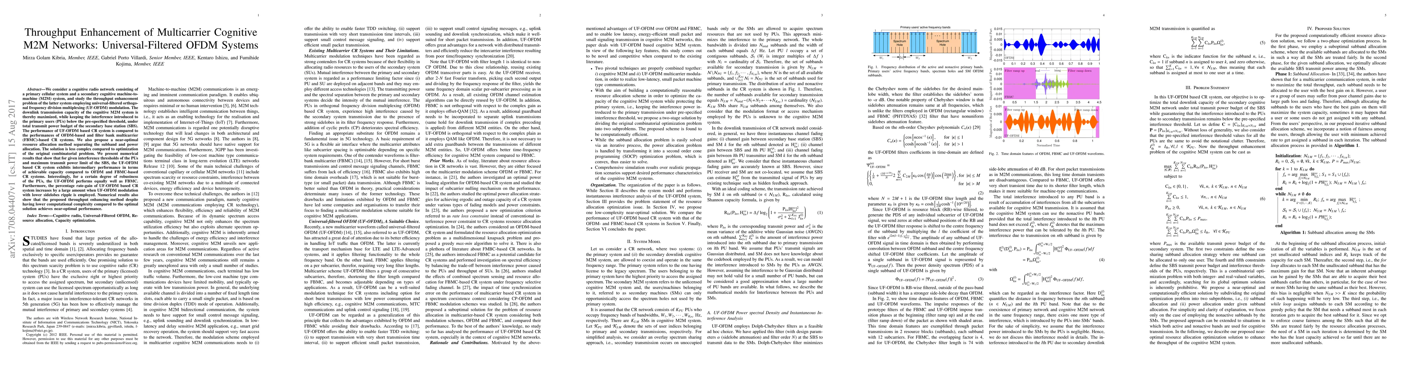 We consider a cognitive radio network consisting of a primary cellular system and a secondary cognitive machine-to-machine (M2M) system, and study the throughput enhancement problem of the latter system employing universal-filtered orthogonal frequency division multiplexing (UF-OFDM) modulation. The downlink transmission capacity of the cognitive M2M system is thereby maximized, while keeping the interference introduced to the primary users (PUs) below the pre-specified threshold, under total transmit power budget of the secondary base station (SBS). The performance of UF-OFDM based CR system is compared to the performances of OFDM-based and filter bank multicarrier (FBMC)-based CR systems. We also propose a near-optimal resource allocation method separating the subband and power allocation. The solution is less complex compared to optimization of the original combinatorial problem. We present numerical results that show that for given interference thresholds of the PUs and maximum transmit power limit of the SBS, the UF-OFDM based CR system exhibits intermediary performance in terms of achievable capacity compared to OFDM and FBMC-based CR systems. Interestingly, for a certain degree of robustness of the PUs, the UF-OFDM performs equally well as FBMC. Furthermore, the percentage rate-gain of UF-OFDM based CR system increases by a large amount when UF-OFDM modulation with lower sidelobes ripple is employed. Numerical results also show that the proposed throughput enhancing method despite having lower computational complexity compared to the optimal solution achieves near-optimal performance.