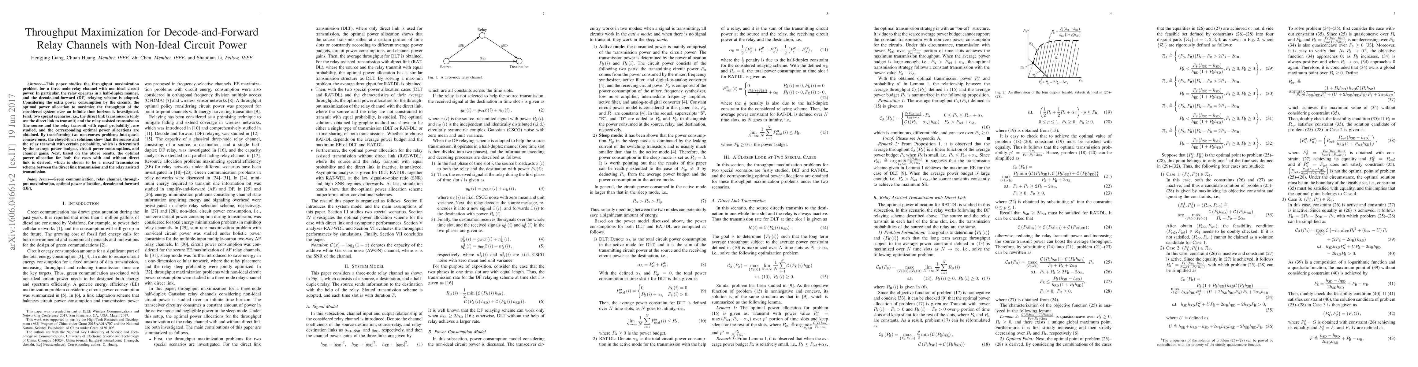 This paper investigates throughput maximization in a decode-and-forward relay channel with non-ideal circuit power, deriving optimal power allocations for scenarios with and without direct link transmission. The analysis reveals a mixed transmission scheme based on average power budgets, circuit power, and channel gains.