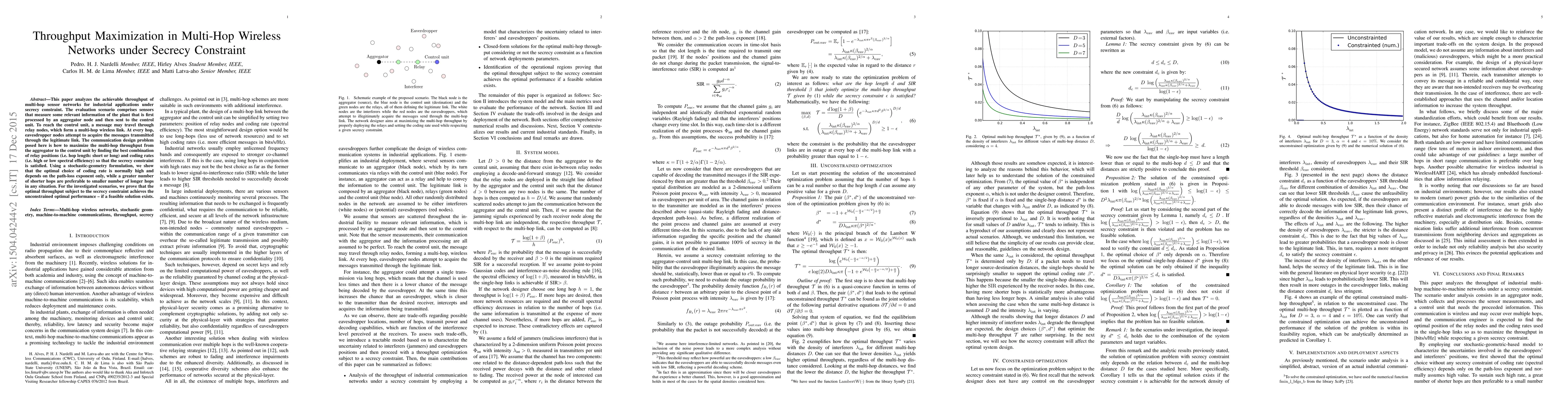 This paper investigates throughput maximization in multi-hop wireless industrial networks under secrecy constraints, proposing optimal relay positions and coding rates to ensure secure communication. It concludes that shorter hops and higher coding rates are preferable when feasible, achieving optimal performance if secrecy constraints are met.