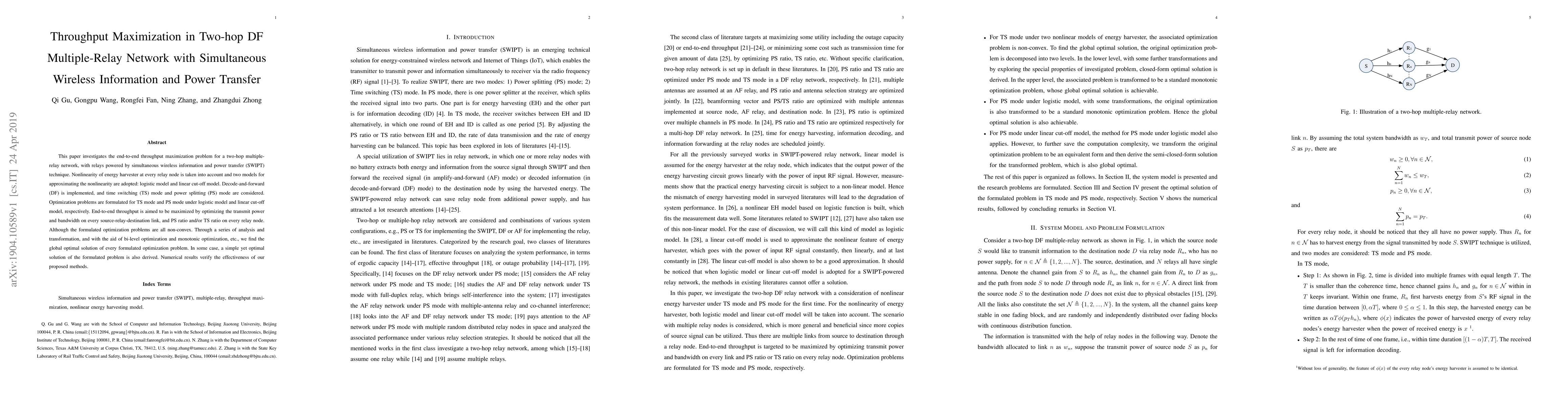 This paper maximizes end-to-end throughput in a two-hop multiple-relay network using SWIPT, considering relay nonlinearity and employing DF with TS and PS modes. Global optimal solutions are derived for non-convex optimization problems, validated by numerical results.