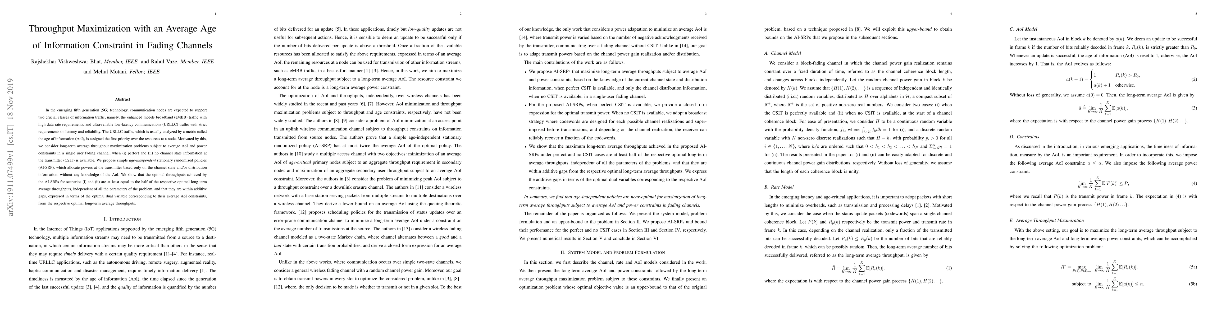 In the emerging fifth generation (5G) technology, communication nodes are expected to support two crucial classes of information traffic, namely, the enhanced mobile broadband (eMBB) traffic with high data rate requirements, and ultra-reliable low-latency communications (URLLC) traffic with strict requirements on latency and reliability. The URLLC traffic, which is usually analyzed by a metric called the age of information (AoI), is assigned the first priority over the resources at a node. Motivated by this, we consider long-term average throughput maximization problems subject to average AoI and power constraints in a single user fading channel, when (i) perfect and (ii) no channel state information at the transmitter (CSIT) is available. We propose simple age-independent stationary randomized policies (AI-SRP), which allocate powers at the transmitter based only on the channel state and/or distribution information, without any knowledge of the AoI. We show that the optimal throughputs achieved by the AI-SRPs for scenarios (i) and (ii) are at least equal to the half of the respective optimal long-term average throughputs, independent of all the parameters of the problem, and that they are within additive gaps, expressed in terms of the optimal dual variable corresponding to their average AoI constraints, from the respective optimal long-term average throughputs.