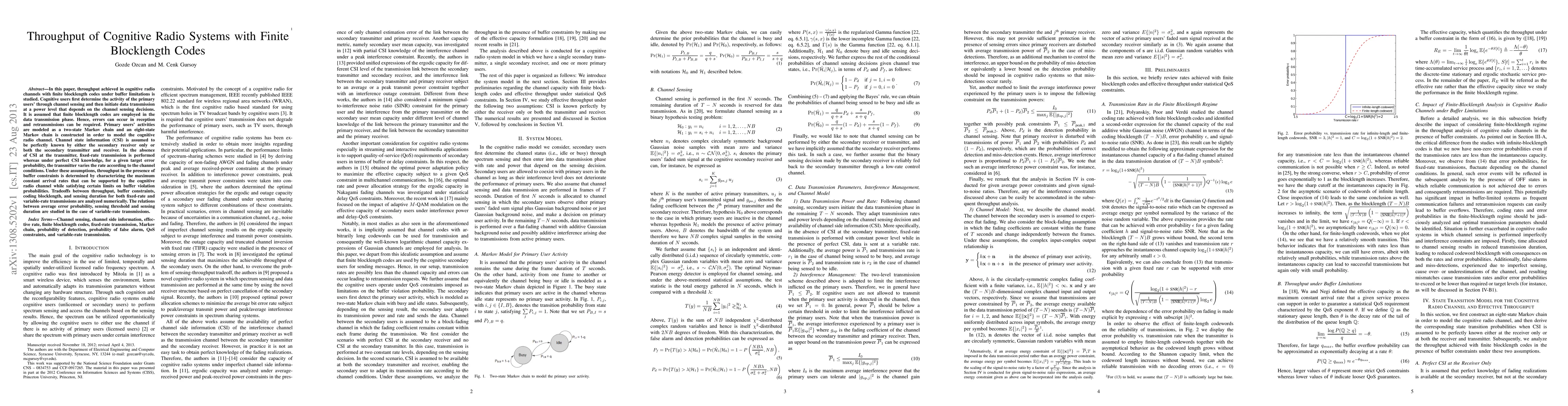 This paper investigates the throughput of cognitive radio systems using finite blocklength codes under buffer limitations, considering channel sensing for primary users and varying transmission rates based on channel state information. It analyzes tradeoffs between throughput, buffer constraints, coding blocklength, and sensing duration, and explores the impact of sensing parameters on error probabilities.