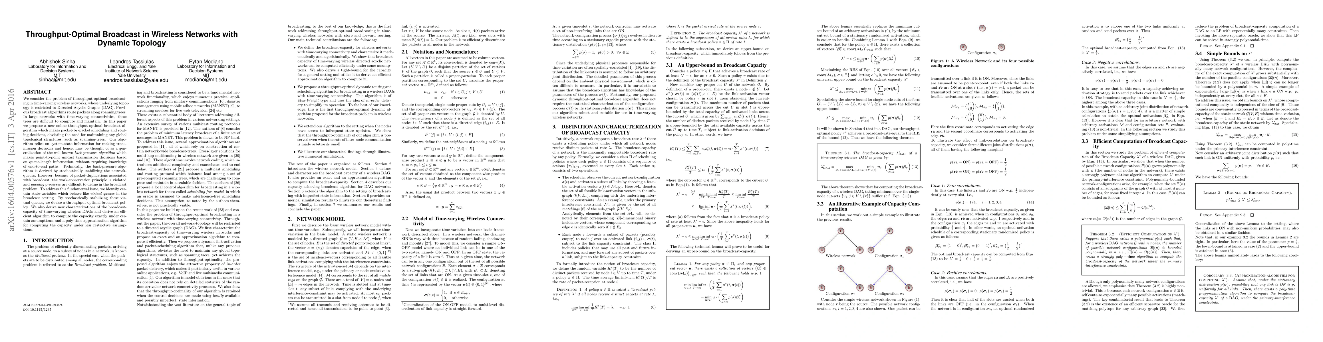 This paper proposes a new online throughput-optimal broadcast algorithm for time-varying wireless networks with Directed Acyclic Graph topology, eliminating the need for maintaining global topological structures. The algorithm generalizes the back-pressure approach by stabilizing virtual queues to achieve optimal throughput.