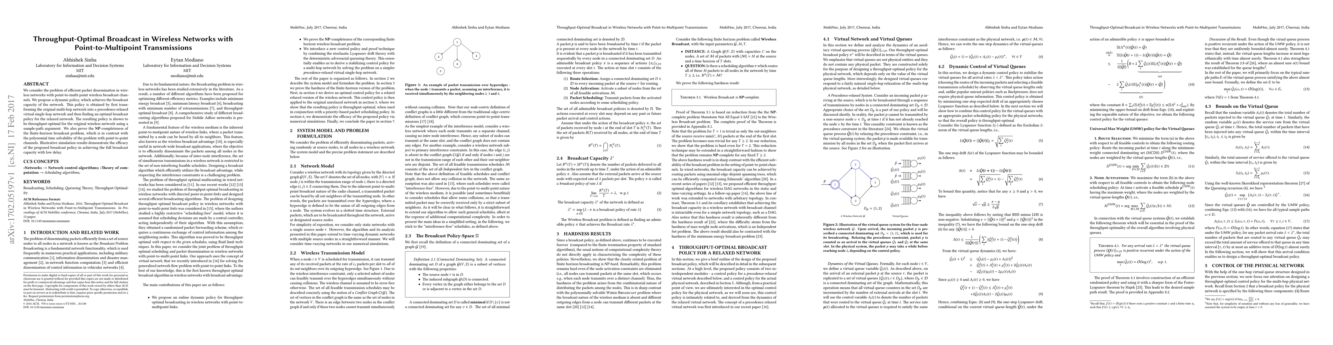 This paper proposes a dynamic policy for efficient packet dissemination in wireless networks with point-to-multipoint transmissions, achieving broadcast capacity by transforming the network into a precedence-relaxed virtual single-hop network. Simulation results show the policy's effectiveness in achieving full broadcast capacity with minimal delay.