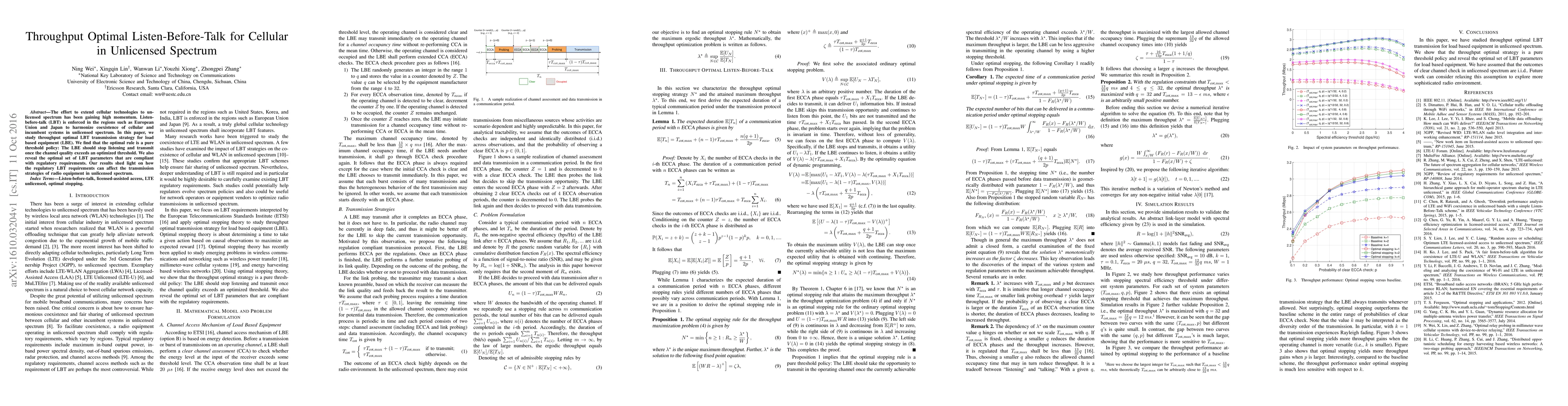 This paper explores throughput optimal Listen-Before-Talk (LBT) strategies for cellular devices in unlicensed spectrum, finding that an optimal threshold policy maximizes throughput. It identifies the best LBT parameters that comply with regulatory standards, highlighting their impact on transmission strategies.