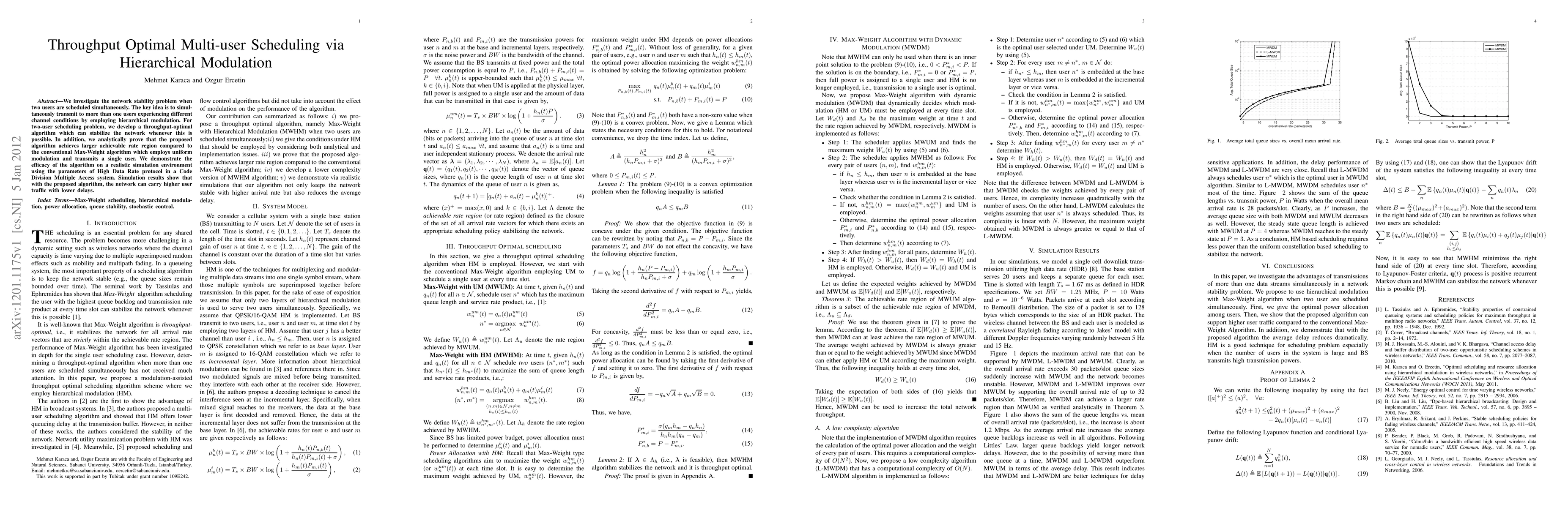 We investigate the network stability problem when two users are scheduled simultaneously. The key idea is to simultaneously transmit to more than one users experiencing different channel conditions by employing hierarchical modulation. For two-user scheduling problem, we develop a throughput-optimal algorithm which can stabilize the network whenever this is possible. In addition, we analytically prove that the proposed algorithm achieves larger achievable rate region compared to the conventional Max-Weight algorithm which employs uniform modulation and transmits a single user. We demonstrate the efficacy of the algorithm on a realistic simulation environment using the parameters of High Data Rate protocol in a Code Division Multiple Access system. Simulation results show that with the proposed algorithm, the network can carry higher user traffic with lower delays.