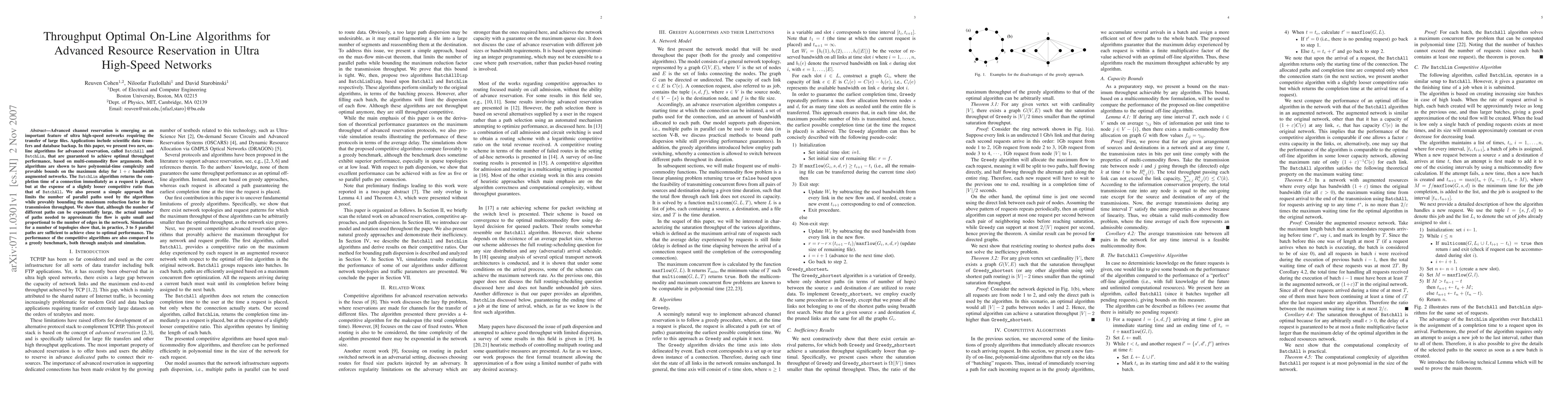 Advanced channel reservation is emerging as an important feature of ultra high-speed networks requiring the transfer of large files. Applications include scientific data transfers and database backup. In this paper, we present two new, on-line algorithms for advanced reservation, called BatchAll and BatchLim, that are guaranteed to achieve optimal throughput performance, based on multi-commodity flow arguments. Both algorithms are shown to have polynomial-time complexity and provable bounds on the maximum delay for 1+epsilon bandwidth augmented networks. The BatchLim algorithm returns the completion time of a connection immediately as a request is placed, but at the expense of a slightly looser competitive ratio than that of BatchAll. We also present a simple approach that limits the number of parallel paths used by the algorithms while provably bounding the maximum reduction factor in the transmission throughput. We show that, although the number of different paths can be exponentially large, the actual number of paths needed to approximate the flow is quite small and proportional to the number of edges in the network. Simulations for a number of topologies show that, in practice, 3 to 5 parallel paths are sufficient to achieve close to optimal performance. The performance of the competitive algorithms are also compared to a greedy benchmark, both through analysis and simulation.