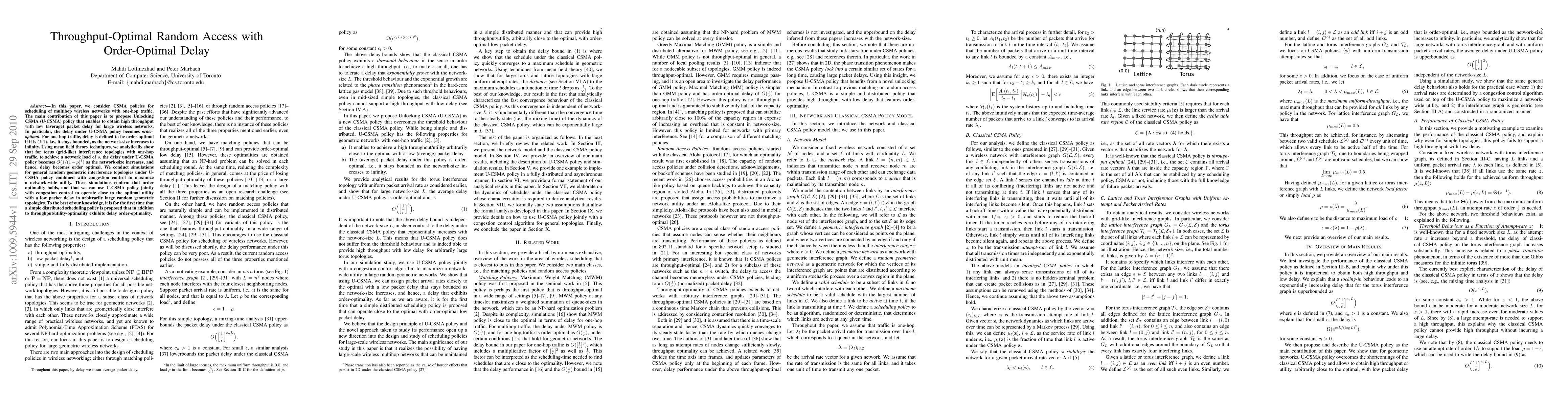 This paper proposes the Unlocking CSMA (U-CSMA) policy for multihop wireless networks, achieving high throughput and order-optimal delay (O(1)) as network size increases. Simulations confirm that U-CSMA combined with congestion control maximizes utility while maintaining low packet delay in large random geometric topologies.