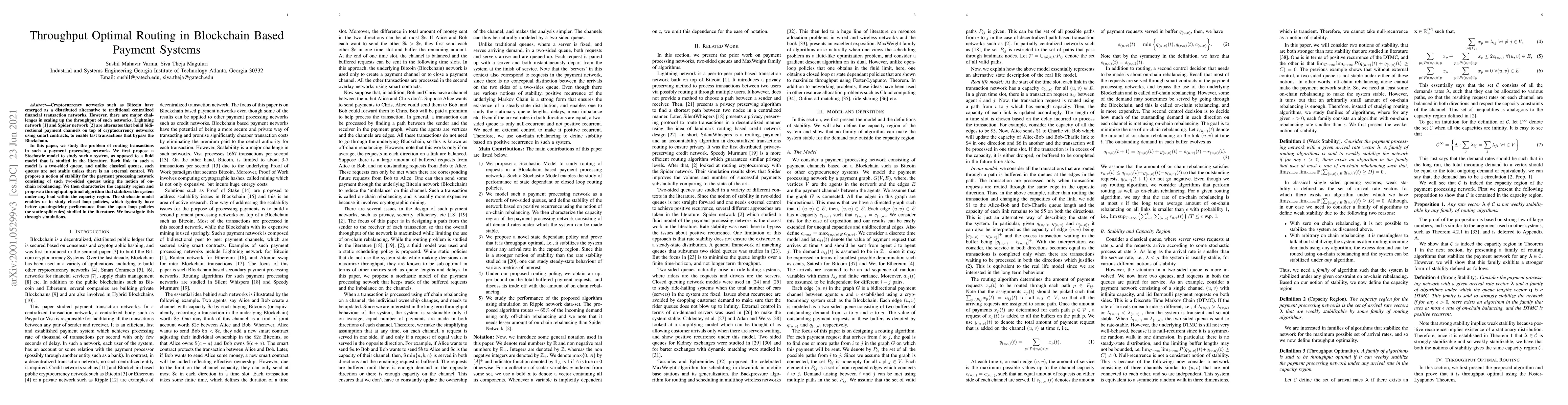 This paper proposes a stochastic model for routing transactions in blockchain-based payment networks like Lightning Network, introducing a stability notion via on-chain rebalancing. It characterizes the capacity region and presents a throughput optimal algorithm to stabilize the system, demonstrating better performance through simulations compared to open loop policies.