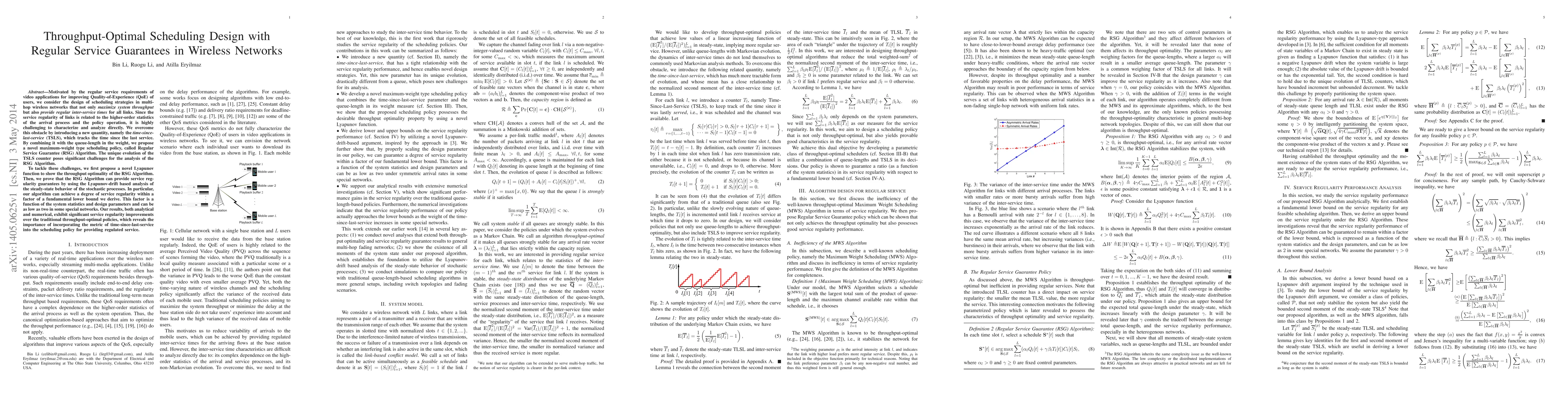 This paper proposes a novel scheduling algorithm, the Regular Service Guarantee (RSG) Algorithm, to maximize throughput in multi-hop wireless networks while ensuring regular service times for all links. It introduces a time-since-last-service (TSLS) metric and uses a Lyapunov function to demonstrate the throughput optimality and service regularity of the algorithm.