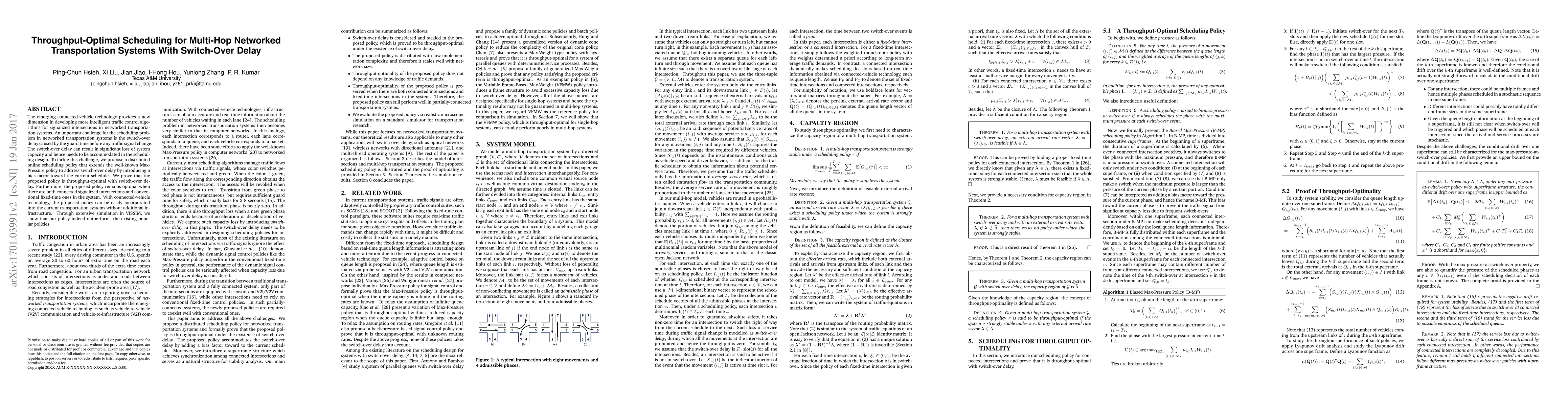 This paper proposes a distributed online scheduling policy to optimize throughput in multi-hop networked transportation systems, addressing switch-over delays at signalized intersections. The policy extends the Max-Pressure approach and is proven to be throughput-optimal, even when conventional fixed-time intersections are present.