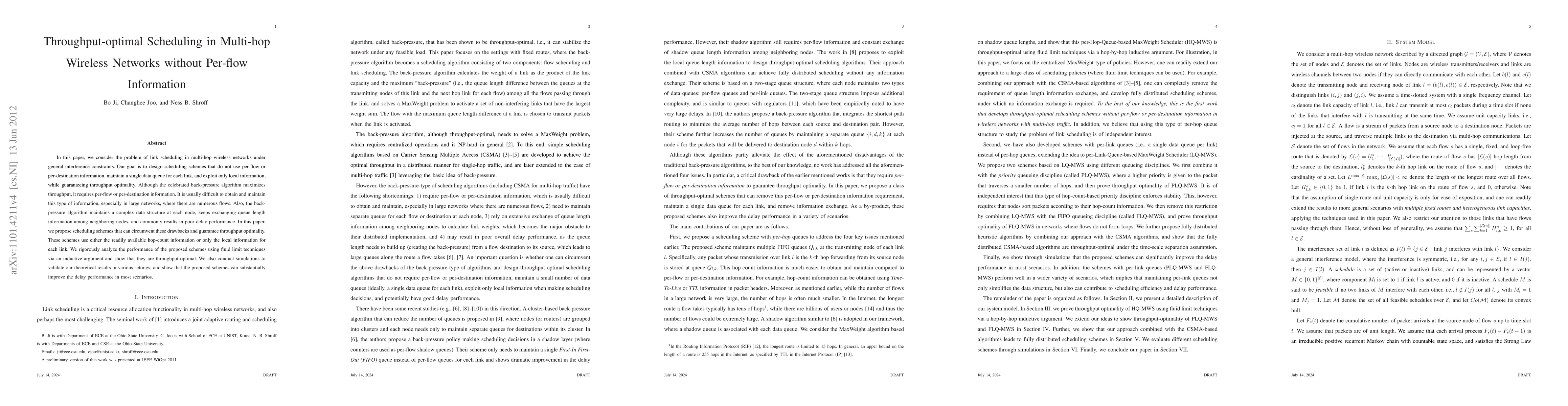 This paper proposes throughput-optimal scheduling schemes for multi-hop wireless networks that do not require per-flow information, maintain a single data queue per link, and use only local information. The proposed schemes achieve throughput optimality without the drawbacks of complex data structures and poor delay performance associated with traditional back-pressure algorithms.