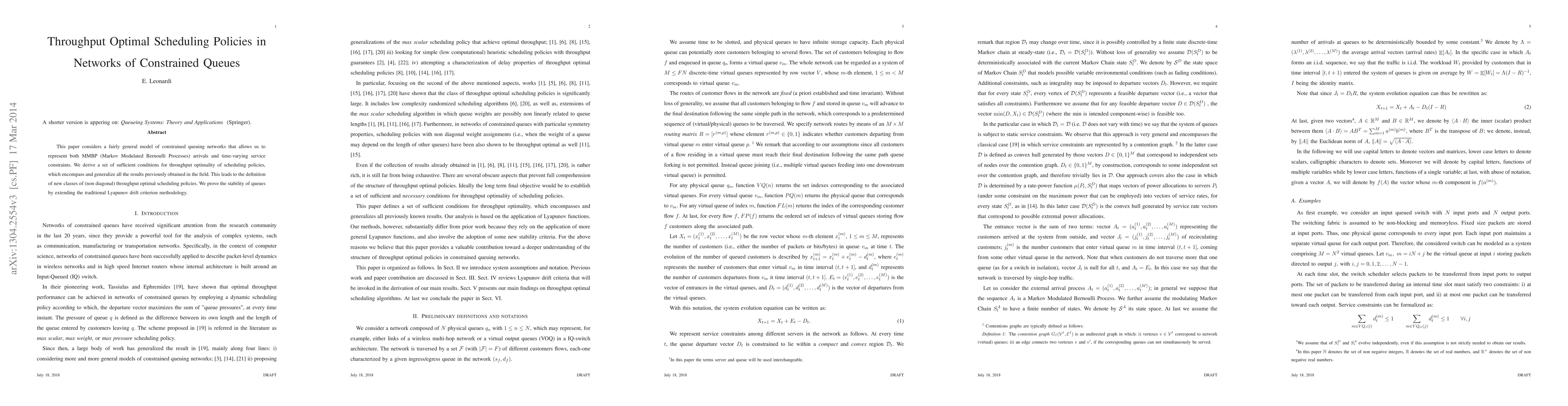This report considers a fairly general model of constrained queuing networks that allows us to represent both MMBP (Markov Modulated Bernoulli Processes) arrivals and time-varying service constraints. We derive a set of sufficient conditions for throughput optimality of scheduling policies that encompass and generalize all the previously obtained results in the field. This leads to the definition of new classes of (non diagonal) throughput optimal scheduling policies. We prove the stability of queues by extending the traditional Lyapunov drift criteria methodology.
