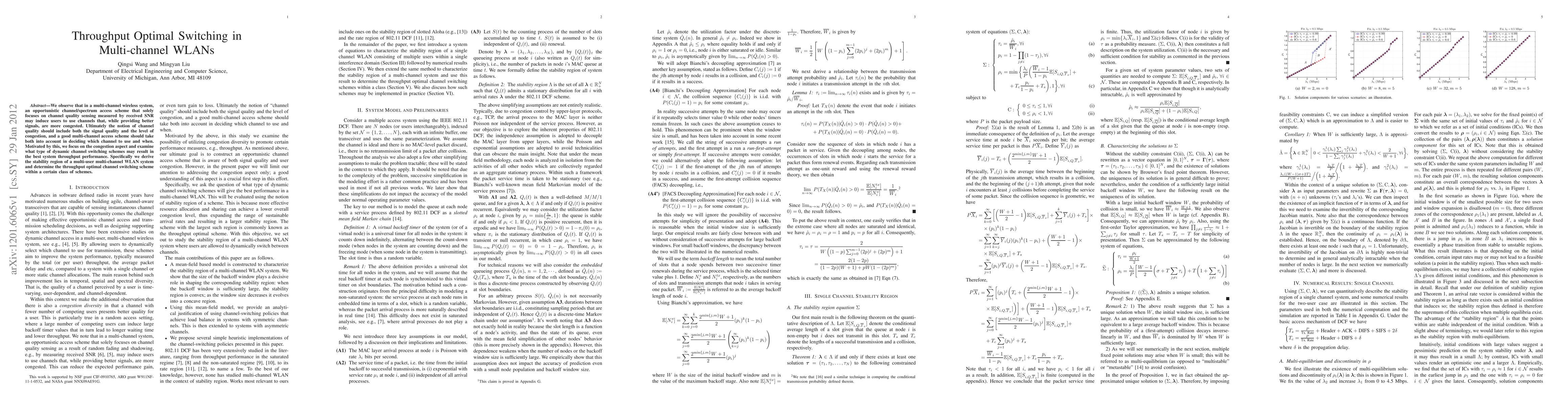 We observe that in a multi-channel wireless system, an opportunistic channel/spectrum access scheme that solely focuses on channel quality sensing measured by received SNR may induce users to use channels that, while providing better signals, are more congested. Ultimately the notion of channel quality should include both the signal quality and the level of congestion, and a good multi-channel access scheme should take both into account in deciding which channel to use and when. Motivated by this, we focus on the congestion aspect and examine what type of dynamic channel switching schemes may result in the best system throughput performance. Specifically we derive the stability region of a multi-user multi-channel WLAN system and determine the throughput optimal channel switching scheme within a certain class of schemes.