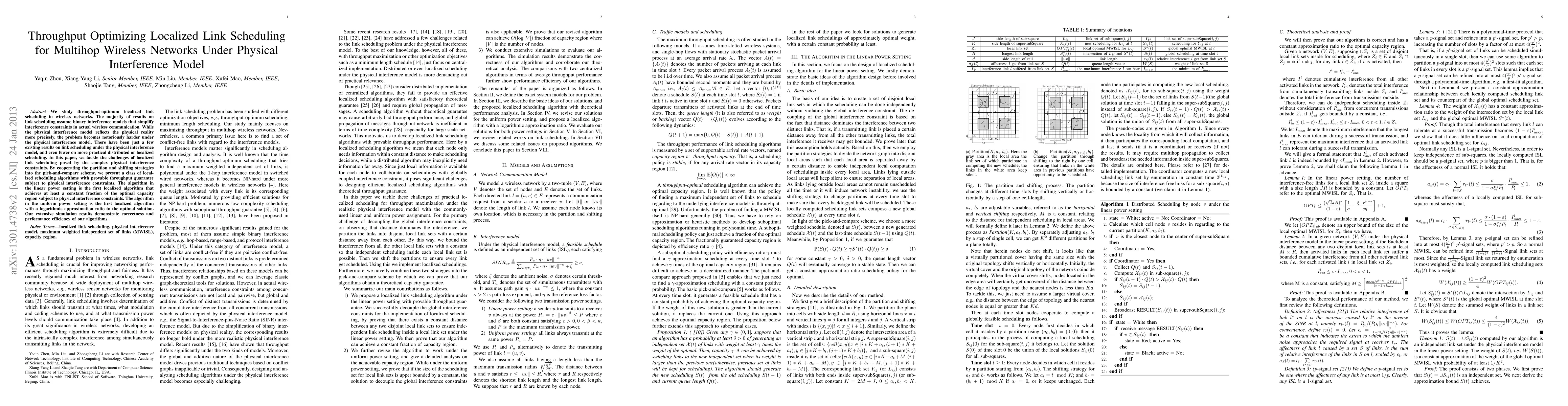 This paper proposes localized link scheduling algorithms for multihop wireless networks under physical interference models, achieving throughput optimization through cooperative partition and shifting strategies. The algorithms provide provable throughput guarantees and are the first localized solutions to achieve constant fractions or logarithmic approximations of optimal capacity under physical interference constraints.