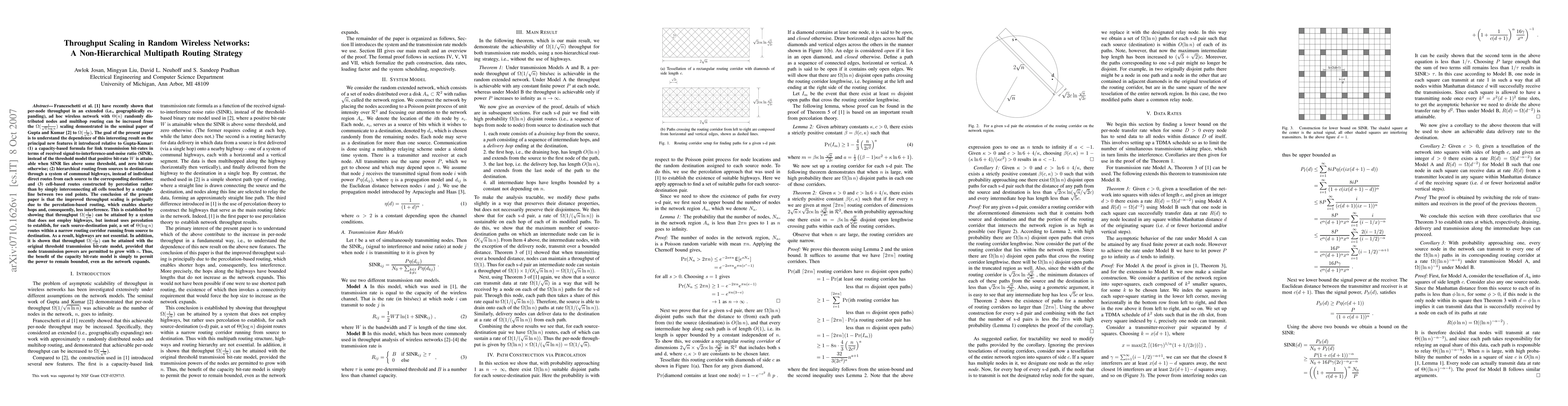 A new routing strategy in random wireless networks achieves θ({1 √ sqrt{n}}) throughput scaling without hierarchical routing or highways, relying on percolation-based routes for shorter hops and reduced interference.