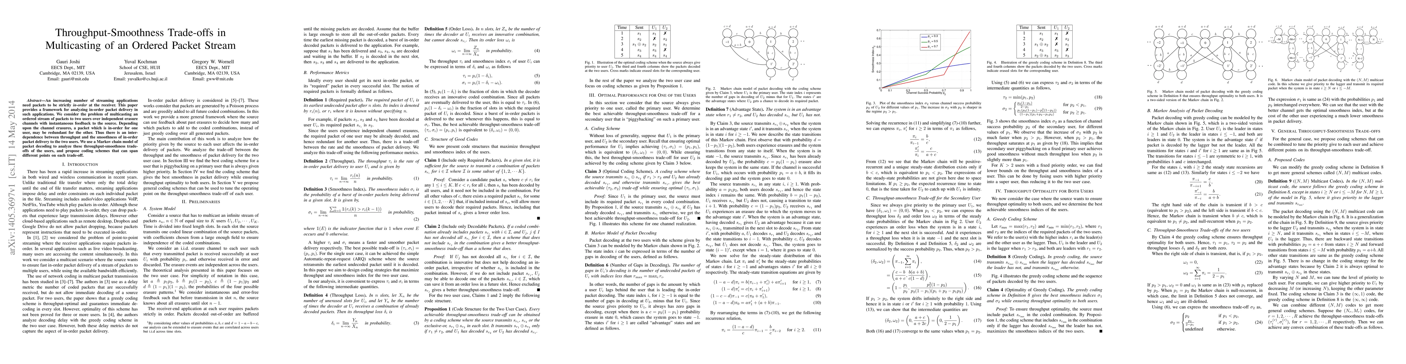 This paper analyzes the trade-off between throughput and the smoothness of in-order packet delivery in multicasting applications over erasure channels. It proposes coding schemes that optimize these trade-offs by considering the inter-dependence of packet relevance to different users.