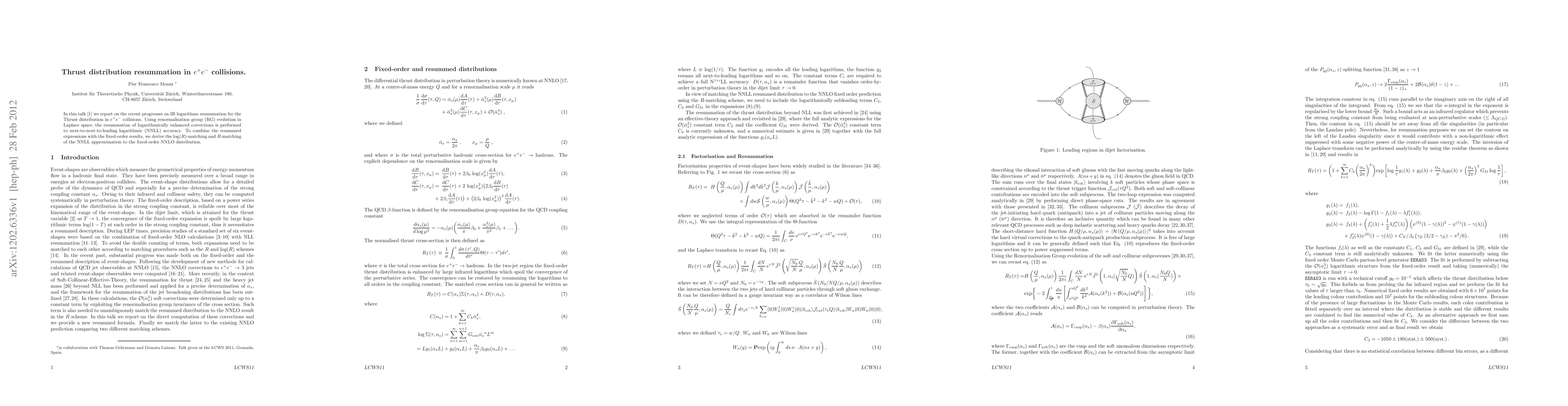 This paper discusses advancements in resummation techniques for IR logarithms affecting the Thrust distribution in electron-positron collisions, achieving next-to-next-to-leading logarithmic (NNLL) accuracy using renormalisation group evolution in Laplace space. It also details the log(R)-matching and R-matching methods to integrate these resummed expressions with fixed-order NNLO results.