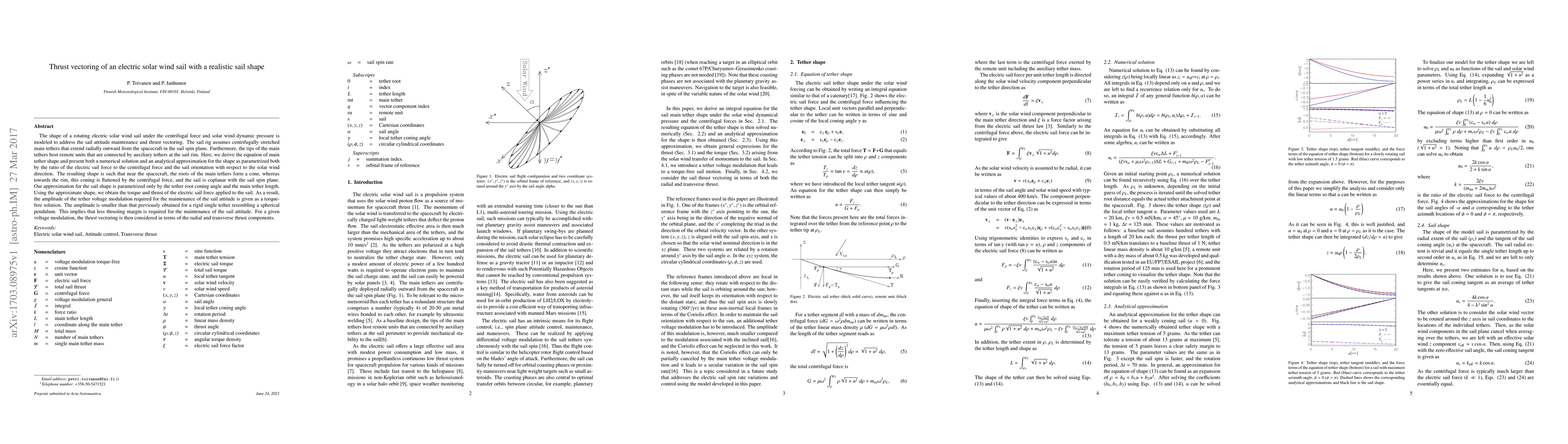 This paper models the shape of a rotating electric solar wind sail under centrifugal and solar wind forces, deriving equations for the main tether shape and presenting both numerical and analytical approximations. The study shows that the required tether voltage modulation for maintaining sail attitude is lower than for a rigid single tether, indicating reduced thrusting margin, and discusses thrust vectoring in terms of radial and transverse components.