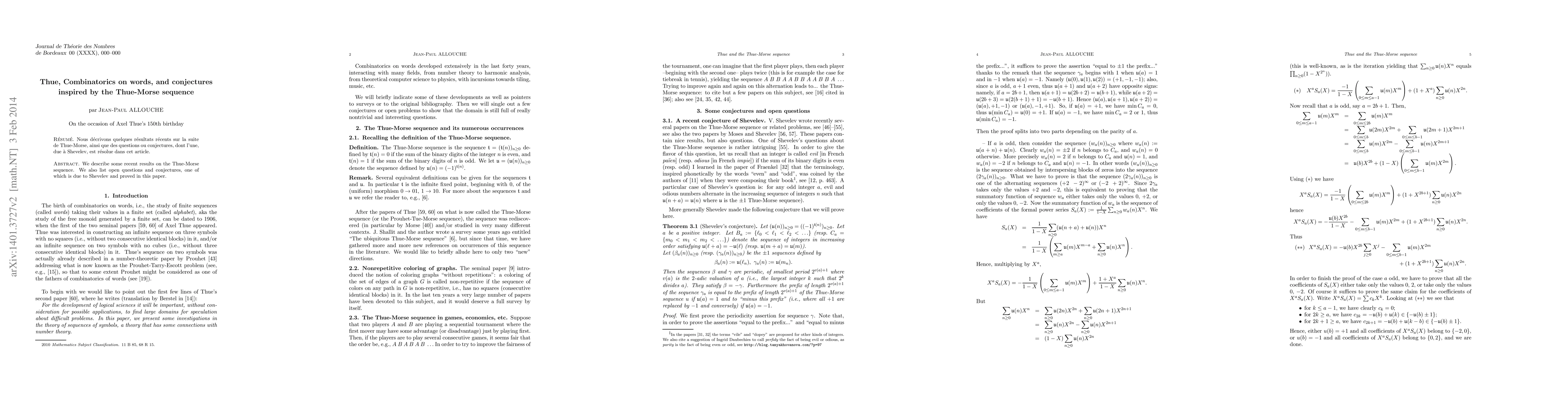 This paper discusses recent findings on the Thue-Morse sequence and its combinatorial properties in words. It resolves Shevelev's conjecture related to the sequence and proposes further open questions in the field.