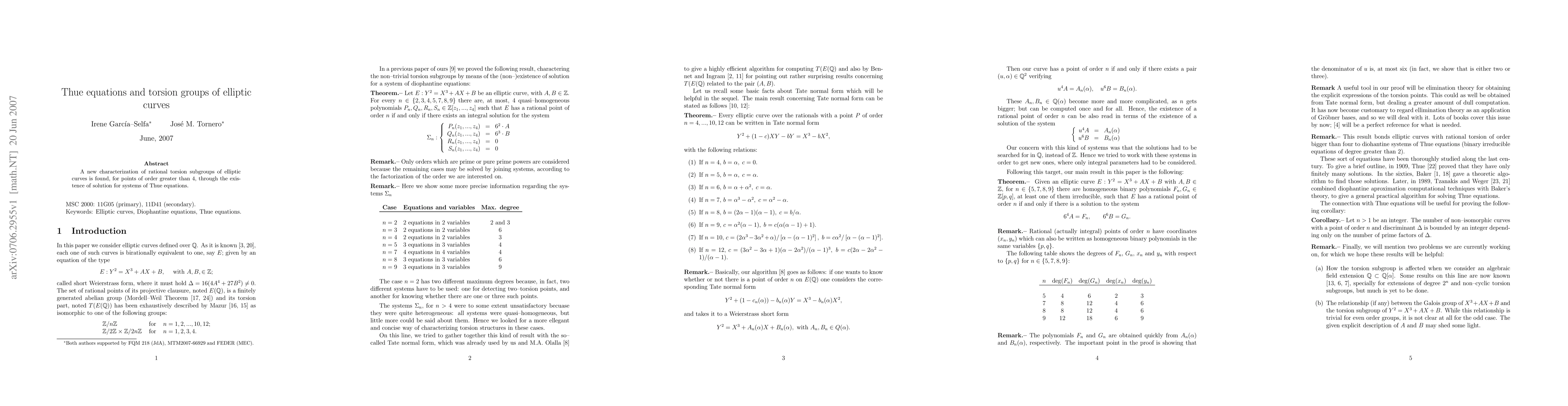 The paper derives a new characterization of rational torsion subgroups of elliptic curves for points of order greater than 4 by finding solutions for systems of Thue equations.