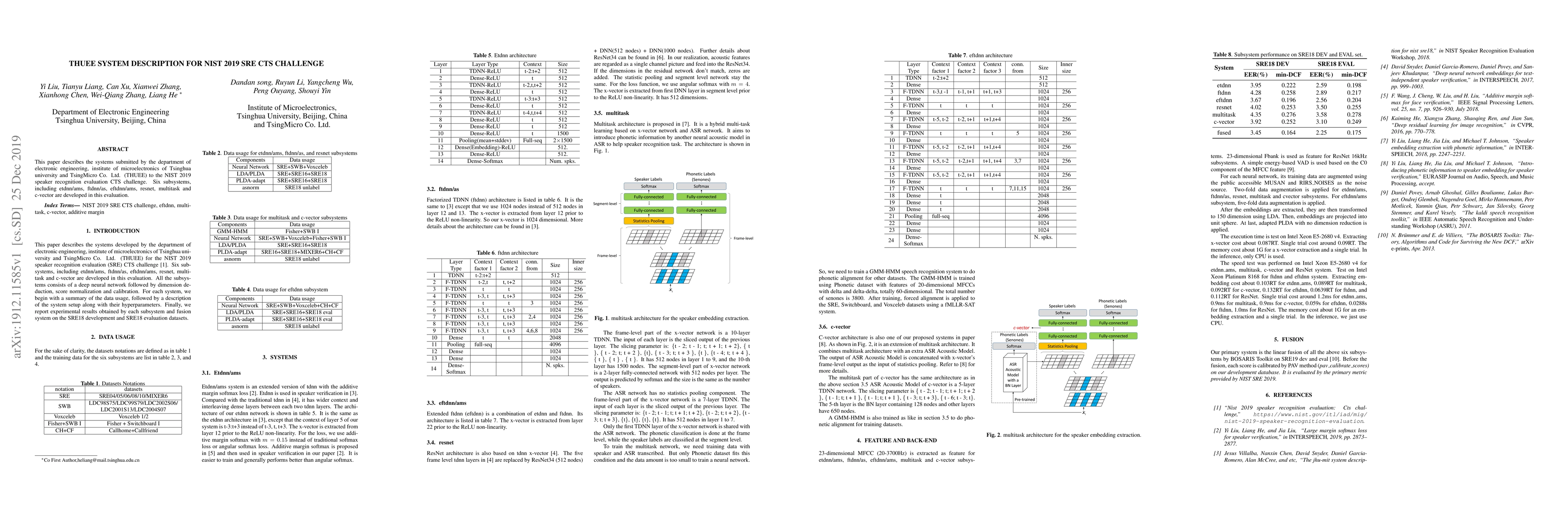 The THUEE system, developed by Tsinghua University and TsingMicro, submitted six subsystems (eddtn/ams, ftdnn/as, eftdnn/ams, resnet, multitask, and c-vector) for NIST 2019 SRE CTS Challenge. This paper details their methodology and findings in speaker recognition evaluation.