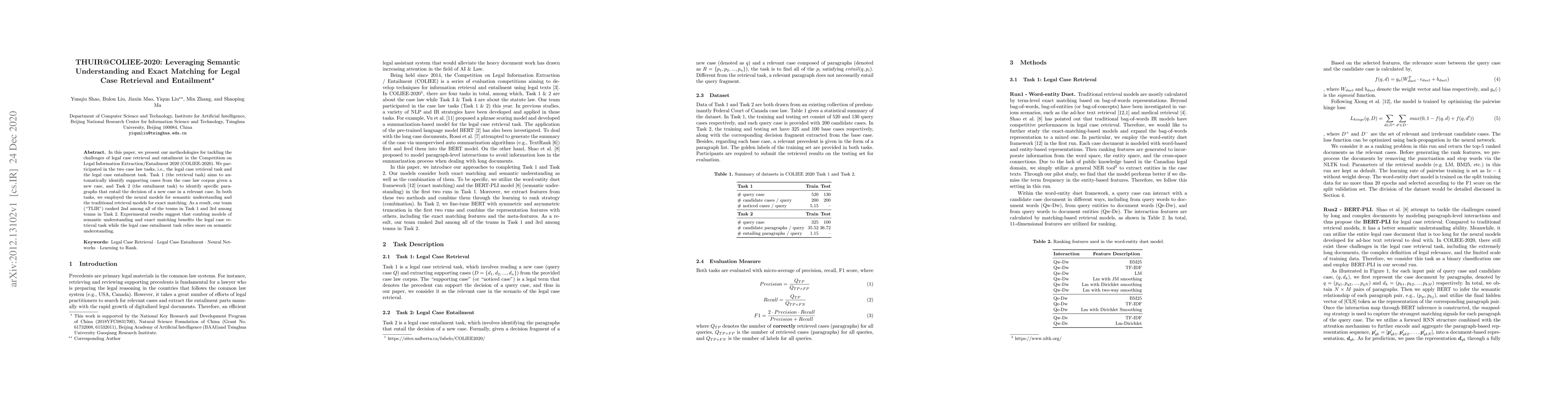 In this paper, we present our methodologies for tackling the challenges of legal case retrieval and entailment in the Competition on Legal Information Extraction / Entailment 2020 (COLIEE-2020). We participated in the two case law tasks, i.e., the legal case retrieval task and the legal case entailment task. Task 1 (the retrieval task) aims to automatically identify supporting cases from the case law corpus given a new case, and Task 2 (the entailment task) to identify specific paragraphs that entail the decision of a new case in a relevant case. In both tasks, we employed the neural models for semantic understanding and the traditional retrieval models for exact matching. As a result, our team (TLIR) ranked 2nd among all of the teams in Task 1 and 3rd among teams in Task 2. Experimental results suggest that combing models of semantic understanding and exact matching benefits the legal case retrieval task while the legal case entailment task relies more on semantic understanding.