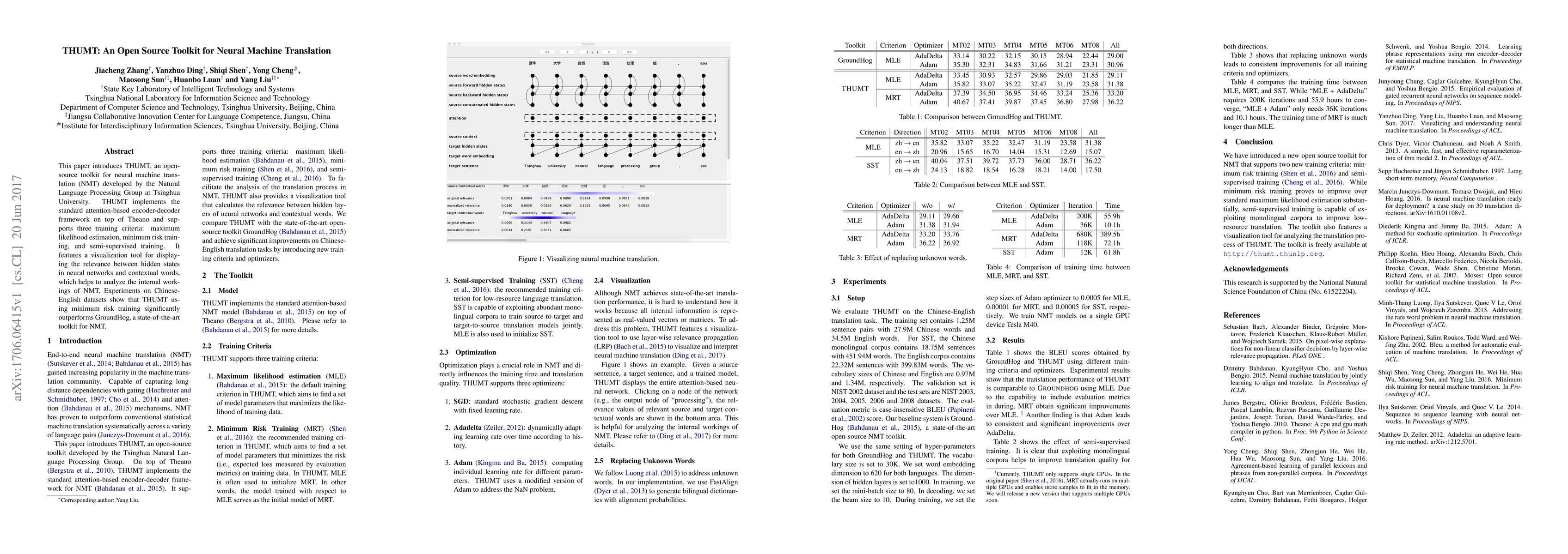The paper introduces THUMT, an open-source toolkit for neural machine translation (NMT) built on Theano, implementing the standard attention-based encoder-decoder framework. It supports three training criteria: maximum likelihood estimation, minimum risk training, and semi-supervised training. THUMT also includes a visualization tool for analyzing the internal workings of NMT by calculating relevance between hidden layers of neural networks and contextual words.