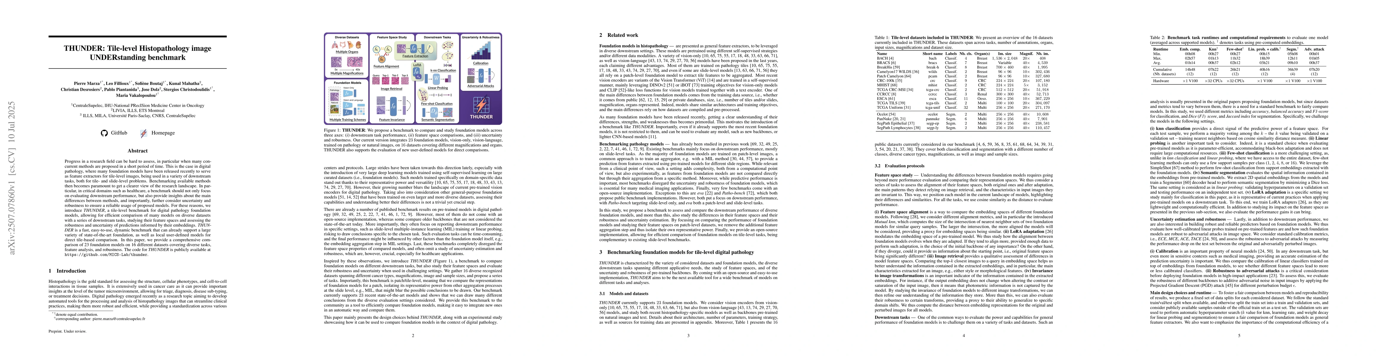 Progress in a research field can be hard to assess, in particular when many concurrent methods are proposed in a short period of time. This is the case in digital pathology, where many foundation models have been released recently to serve as feature extractors for tile-level images, being used in a variety of downstream tasks, both for tile- and slide-level problems. Benchmarking available methods then becomes paramount to get a clearer view of the research landscape. In particular, in critical domains such as healthcare, a benchmark should not only focus on evaluating downstream performance, but also provide insights about the main differences between methods, and importantly, further consider uncertainty and robustness to ensure a reliable usage of proposed models. For these reasons, we introduce THUNDER, a tile-level benchmark for digital pathology foundation models, allowing for efficient comparison of many models on diverse datasets with a series of downstream tasks, studying their feature spaces and assessing the robustness and uncertainty of predictions informed by their embeddings. THUNDER is a fast, easy-to-use, dynamic benchmark that can already support a large variety of state-of-the-art foundation, as well as local user-defined models for direct tile-based comparison. In this paper, we provide a comprehensive comparison of 23 foundation models on 16 different datasets covering diverse tasks, feature analysis, and robustness. The code for THUNDER is publicly available at https://github.com/MICS-Lab/thunder.