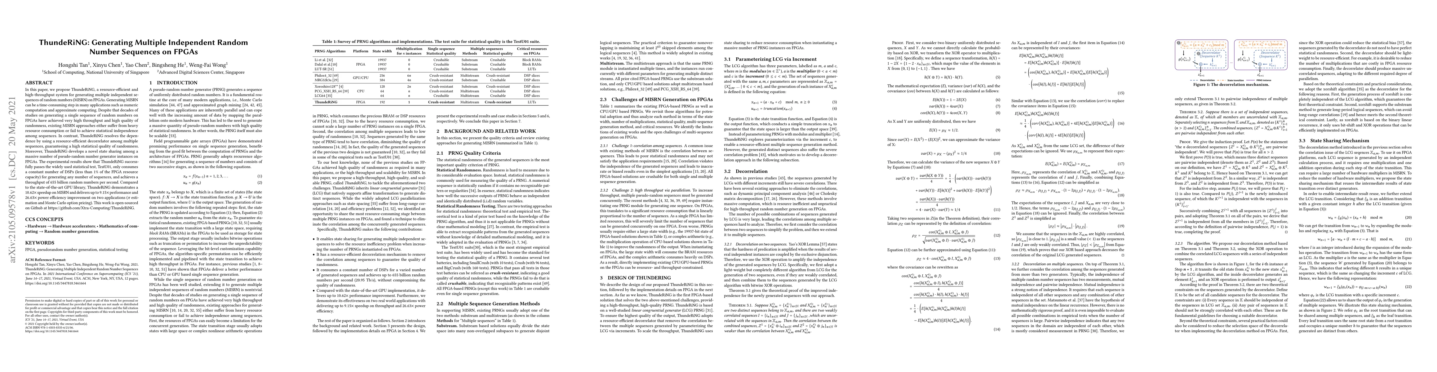 In this paper, we propose ThundeRiNG, a resource-efficient and high-throughput system for generating multiple independent sequences of random numbers (MISRN) on FPGAs. Generating MISRN can be a time-consuming step in many applications such as numeric computation and approximate computing. Despite that decades of studies on generating a single sequence of random numbers on FPGAs have achieved very high throughput and high quality of randomness, existing MISRN approaches either suffer from heavy resource consumption or fail to achieve statistical independence among sequences. In contrast, ThundeRiNG resolves the dependence by using a resource-efficient decorrelator among multiple sequences, guaranteeing a high statistical quality of randomness. Moreover, ThundeRiNG develops a novel state sharing among a massive number of pseudo-random number generator instances on FPGAs. The experimental results show that ThundeRiNG successfully passes the widely used statistical test, TestU01, only consumes a constant number of DSPs (less than 1\% of the FPGA resource capacity) for generating any number of sequences, and achieves a throughput of 655 billion random numbers per second. Compared to the state-of-the-art GPU library, ThundeRiNG demonstrates a $10.62\times$ speedup on MISRN and delivers up to $9.15\times$ performance and $26.63\times$ power efficiency improvement on two applications ($\pi$ estimation and Monte Carlo option pricing). This work is open-sourced on Github at https://github.com/Xtra-Computing/ThundeRiNG