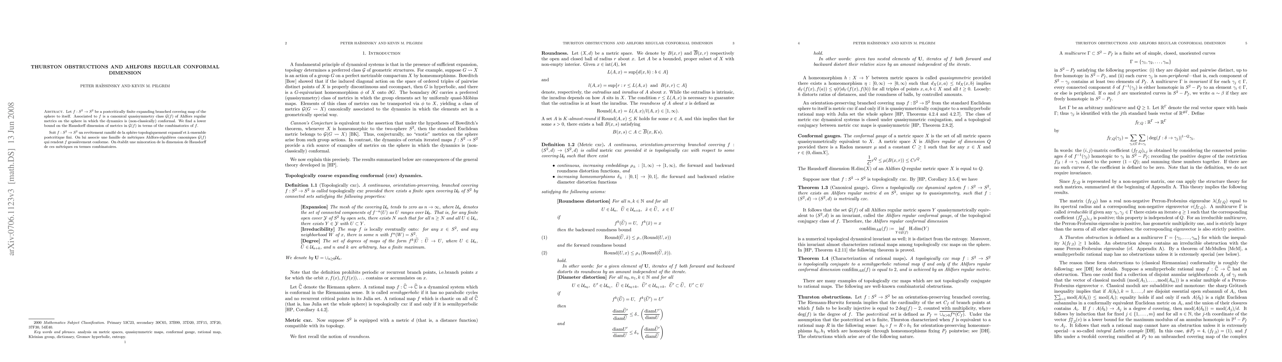 Let $f: S^2 \to S^2$ be an expanding branched covering map of the sphere to itself with finite postcritical set $P_f$. Associated to $f$ is a canonical quasisymmetry class $\GGG(f)$ of Ahlfors regular metrics on the sphere in which the dynamics is (non-classically) conformal. We show \[ \inf_{X \in \GGG(f)} \hdim(X) \geq Q(f)=\inf_\Gamma \{Q \geq 2: \lambda(f_{\Gamma,Q}) \geq 1\}.\] The infimum is over all multicurves $\Gamma \subset S^2-P_f$. The map $f_{\Gamma,Q}: \R^\Gamma \to \R^\Gamma$ is defined by \[ f_{\Gamma, Q}(\gamma) =\sum_{[\gamma']\in\Gamma} \sum_{\delta \sim \gamma'} \deg(f:\delta \to \gamma)^{1-Q}[\gamma'],\] where the second sum is over all preimages $\delta$ of $\gamma$ freely homotopic to $\gamma'$ in $S^2-P_f$, and $ \lambda(f_{\Gamma,Q})$ is its Perron-Frobenius leading eigenvalue. This generalizes Thurston's observation that if $Q(f)>2$, then there is no $f$-invariant classical conformal structure.