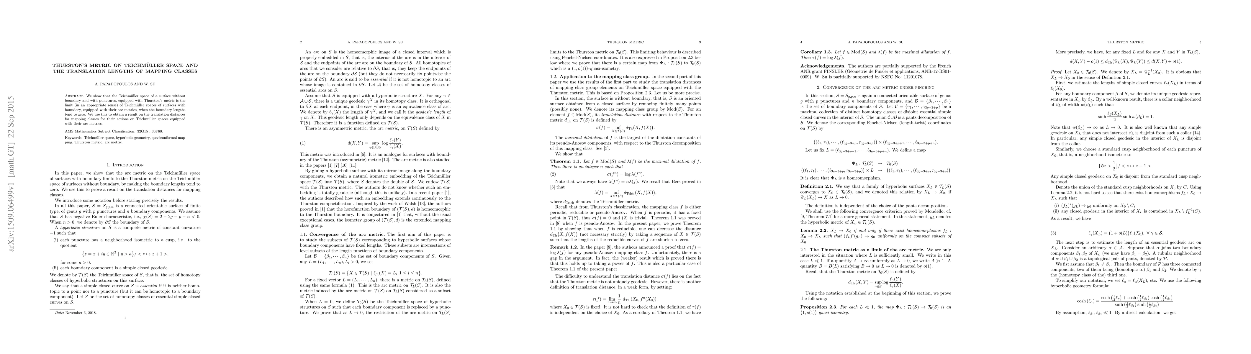Summary: The paper demonstrates that Thurston's metric on Teichmüller space for surfaces without boundary and with punctures converges to Teichmüller spaces of surfaces with boundary as boundary lengths approach zero. It also provides insights into translation distances for mapping classes acting on these spaces.
