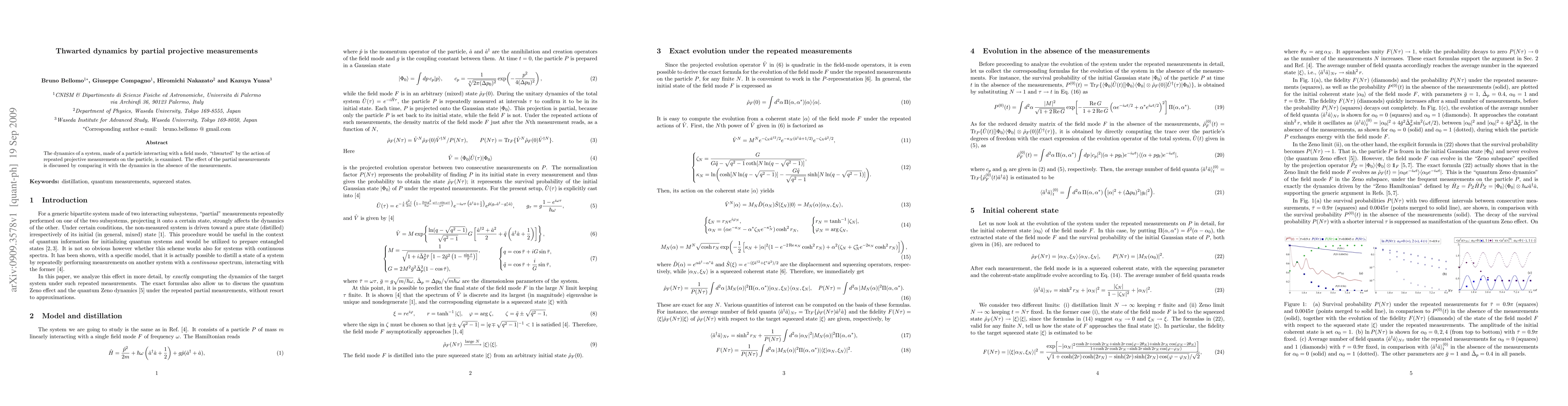 The dynamics of a system, made of a particle interacting with a field mode, thwarted by the action of repeated projective measurements on the particle, is examined. The effect of the partial measurements is discussed by comparing it with the dynamics in the absence of the measurements.