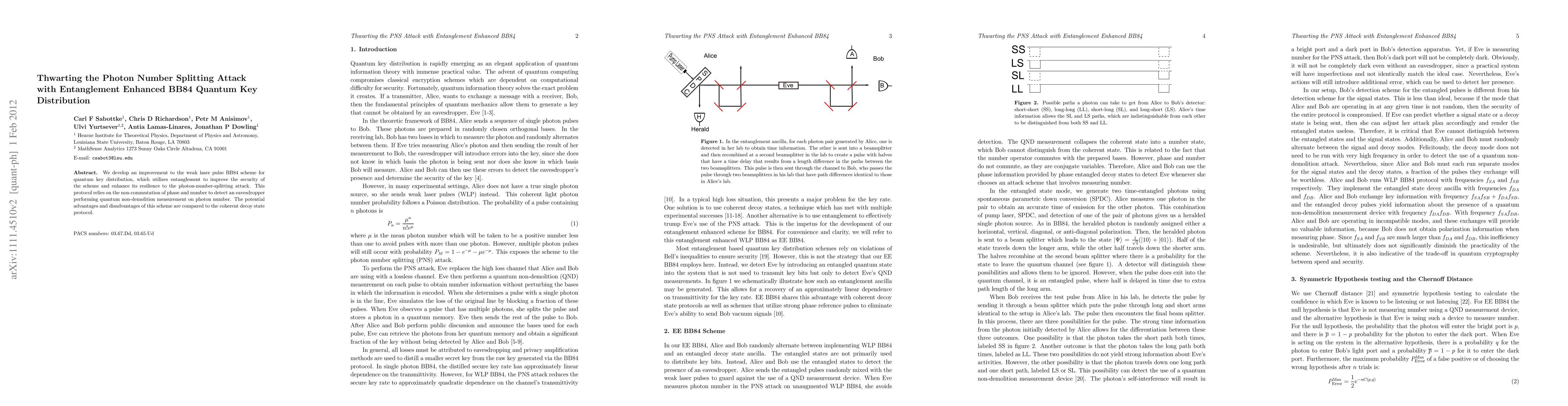 A combination of theoretical analysis and experimental verification was used to evaluate the security of EEB84 against the photon-number-splitting attack.