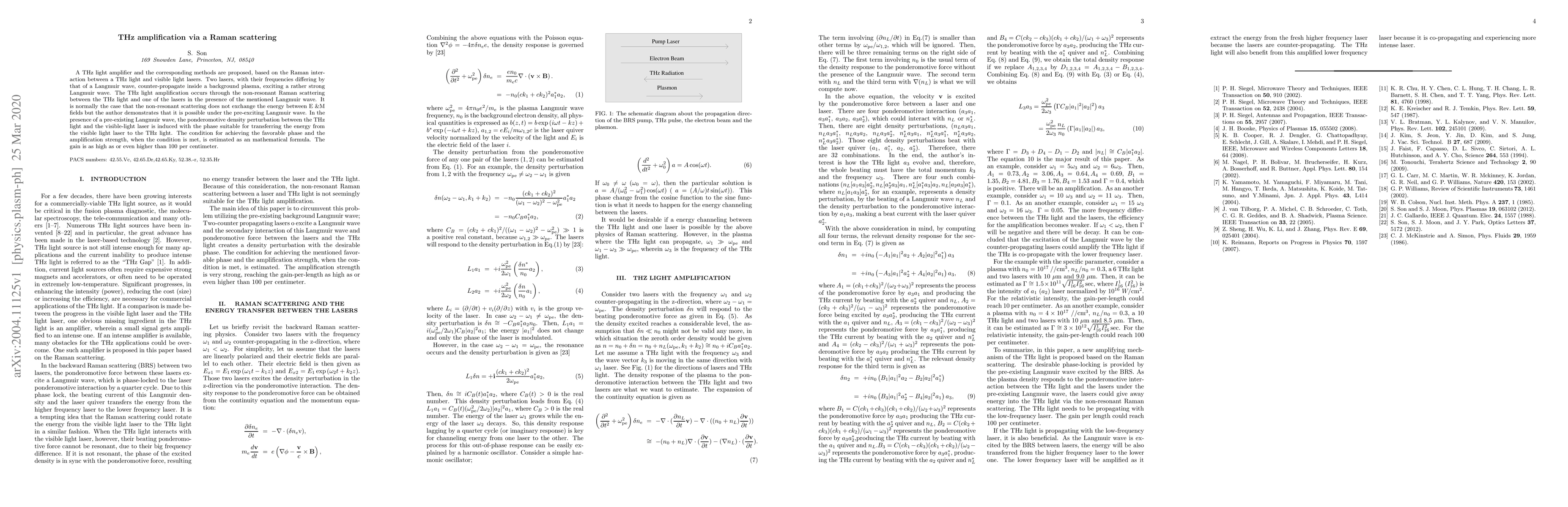Researchers propose a new method for THz amplification using Raman scattering between a THz light and visible lasers in the presence of a pre-excited Langmuir wave, achieving high gain rates of up to 100% per centimeter.