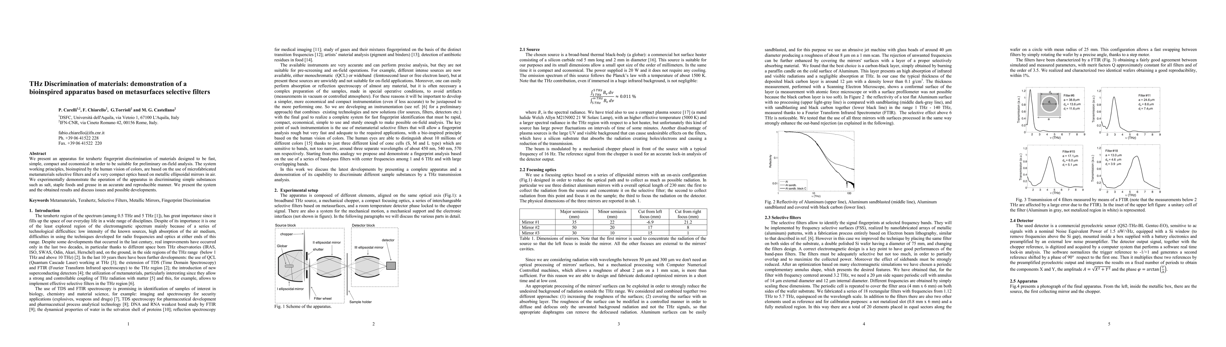 We present an apparatus for terahertz fingerprint discrimination of materials designed to be fast, simple, compact and economical in order to be suitable for preliminary on-field analysis. The system working principles, bioinspired by the human vision of colors, are based on the use of microfabricated metamaterials selective filters and of a very compact optics based on metallic ellipsoidal mirrors in air. We experimentally demonstrate the operation of the apparatus in discriminating simple substances such as salt, staple foods and grease in an accurate and reproducible manner. We present the system and the obtained results and discuss issues and possible developments.