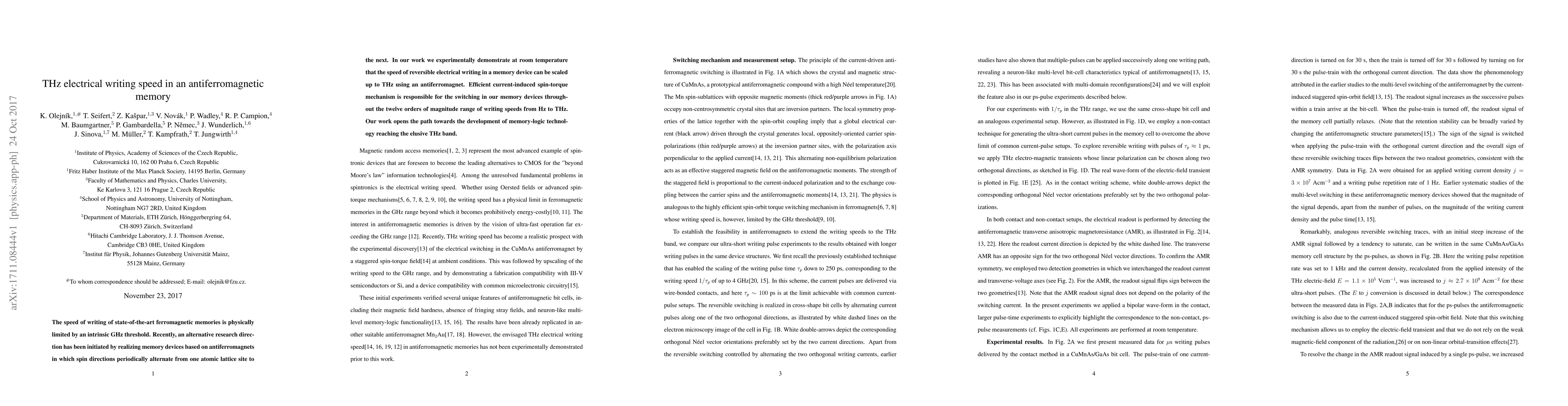 The speed of writing of state-of-the-art ferromagnetic memories is physically limited by an intrinsic GHz threshold. Recently, an alternative research direction has been initiated by realizing memory devices based on antiferromagnets in which spin directions periodically alternate from one atomic lattice site to the next. In our work we experimentally demonstrate at room temperature that the speed of reversible electrical writing in a memory device can be scaled up to THz using an antiferromagnet. Efficient current-induced spin-torque mechanism is responsible for the switching in our memory devices throughout the twelve orders of magnitude range of writing speeds from Hz to THz. Our work opens the path towards the development of memory-logic technology reaching the elusive THz band.