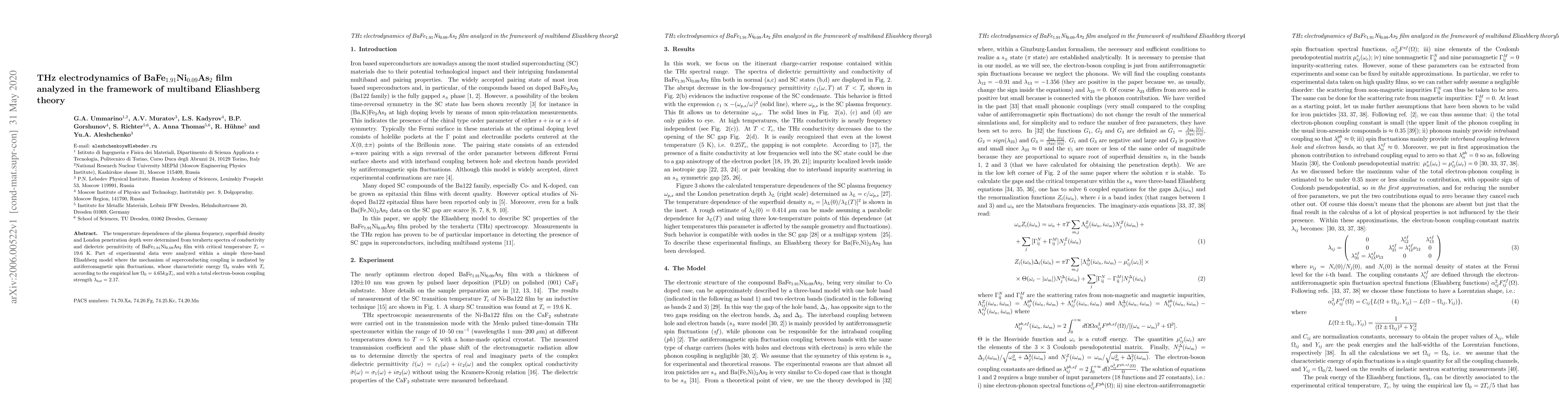 This paper investigates the THz electrodynamics of BaFe$_{1.91}$Ni$_{0.09}$As$_{2}$ film, determining its plasma frequency, superfluid density, and London penetration depth from terahertz spectra. The analysis employs a three-band Eliashberg model to explain superconducting coupling mediated by antiferromagnetic spin fluctuations.