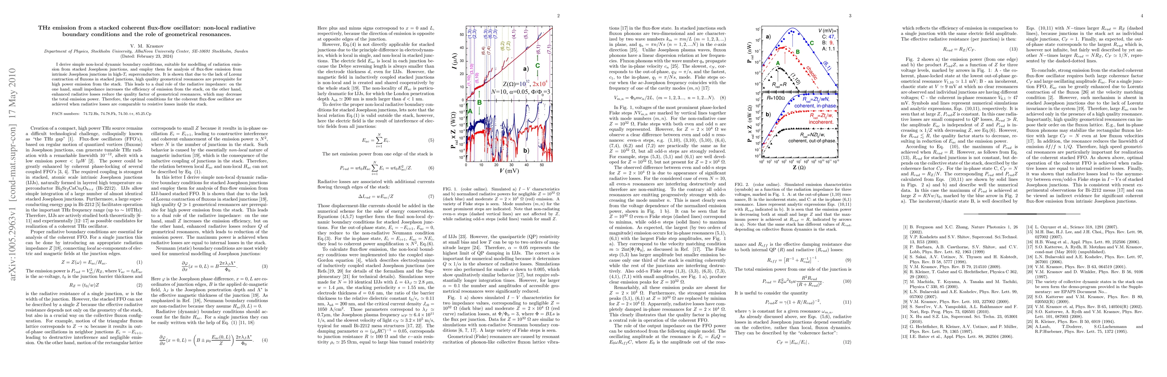 I derive simple non-local dynamic boundary conditions, suitable for modelling of radiation emission from stacked Josephson junctions, and employ them for analysis of flux-flow emission from intrinsic Josephson junctions in high-$T_c$ superconductors. It is shown that due to the lack of Lorenz contraction of fluxons in stacked junctions, high quality geometrical resonances are prerequisite for high power emission from the stack. This leads to a dual role of the radiative impedance: on the one hand, small impedance increases the efficiency of emission from the stack, on the other hand, enhanced radiative losses reduce the quality factor of geometrical resonances, which may decrease the total emission power. Therefore, the optimal conditions for the coherent flux-flow oscillator are achieved when radiative losses are comparable to resistive losses inside the stack.