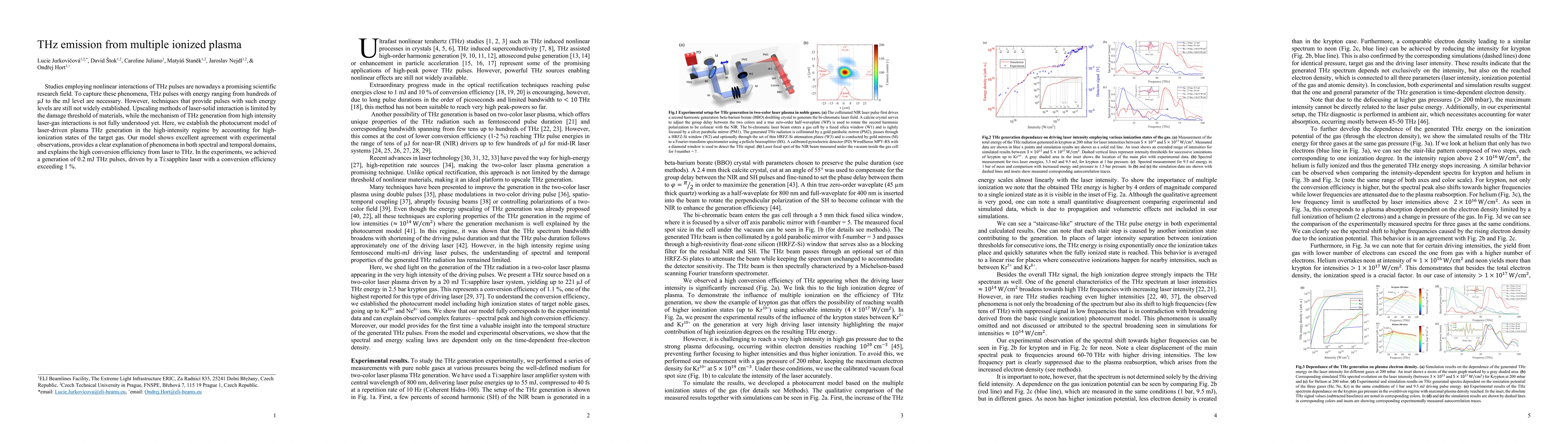 Studies employing nonlinear interactions of THz pulses are nowadays a promising scientific research field. To capture these phenomena, THz pulses with energy ranging from hundreds of \muJ to the mJ level are necessary. However, techniques that provide pulses with such energy levels are still not widely established. Upscaling methods of laser-solid interaction is limited by the damage threshold of materials, while the mechanism of THz generation from high intensity laser-gas interactions is not fully understood yet. Here, we establish the photocurrent model of laser-driven plasma THz generation in the high-intensity regime by accounting for high-ionization states of the target gas. Our model shows excellent agreement with experimental observations, provides a clear explanation of phenomena in both spectral and temporal domains, and explains the high conversion efficiency from laser to THz. In the experiments, we achieved a generation of 0.2 mJ THz pulses, driven by a Ti:sapphire laser with a conversion efficiency exceeding 1 %.