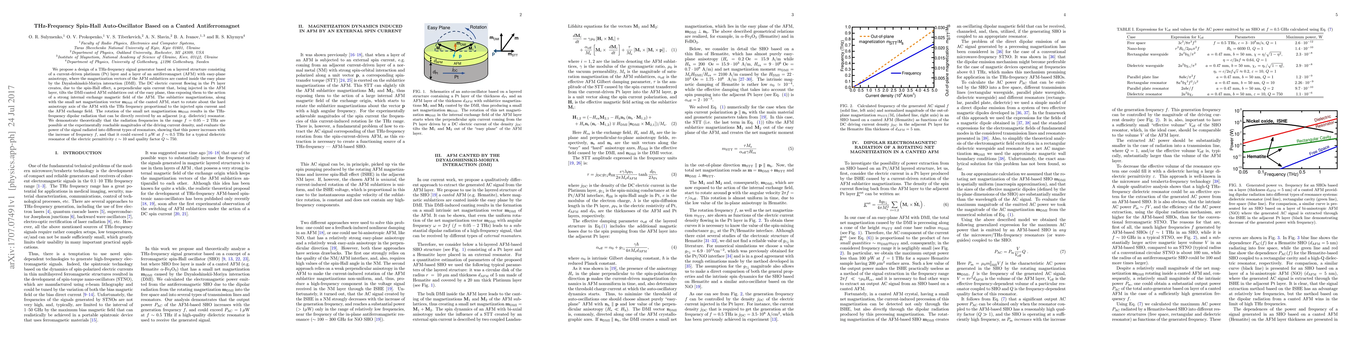 Researchers propose a THz-frequency signal generator using a canted antiferromagnet with a current-driven platinum layer, generating radiation through spin-Hall auto-oscillation, with predicted frequencies in the 0.05-2 THz range and power exceeding 1 ¼W at 0.5 THz.