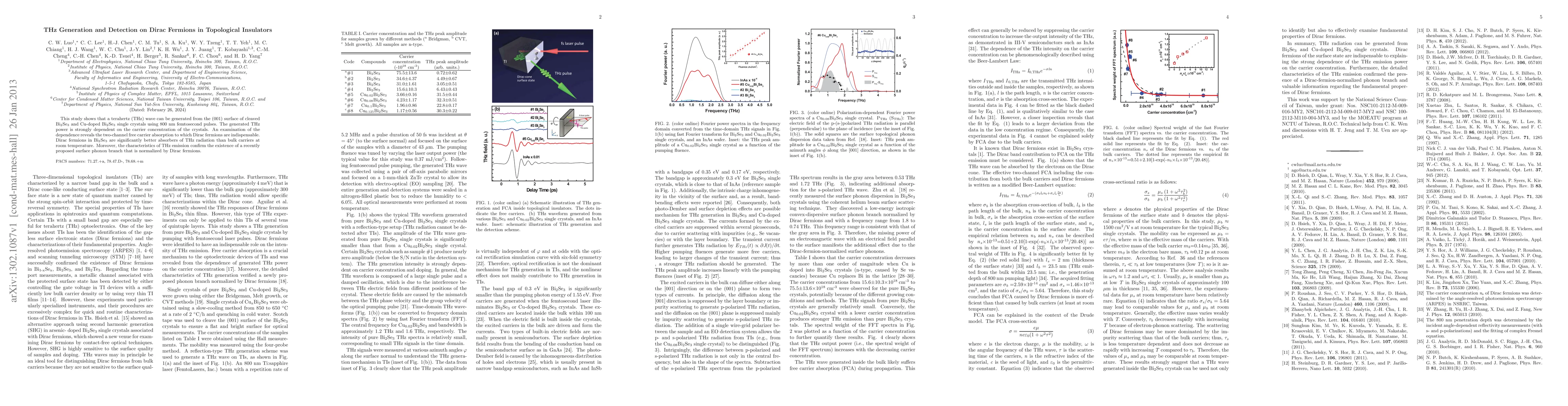 This study shows that a terahertz (THz) wave can be generated from the (001) surface of cleaved Bi$_{\textrm{2}}$Se$_{\textrm{3}}$ and Cu-doped Bi$_{\textrm{2}}$Se$_{\textrm{3}}$ single crystals using 800 nm femtosecond pulses. The generated THz power is strongly dependent on the carrier concentration of the crystals. An examination of the dependence reveals the two-channel free carrier absorption to which Dirac fermions are indispensable. Dirac fermions in Bi$_{\textrm{2}}$Se$_{\textrm{3}}$ are significantly better absorbers of THz radiation than bulk carriers at room temperature. Moreover, the characteristics of THz emission confirm the existence of a recently proposed surface phonon branch that is normalized by Dirac fermions.