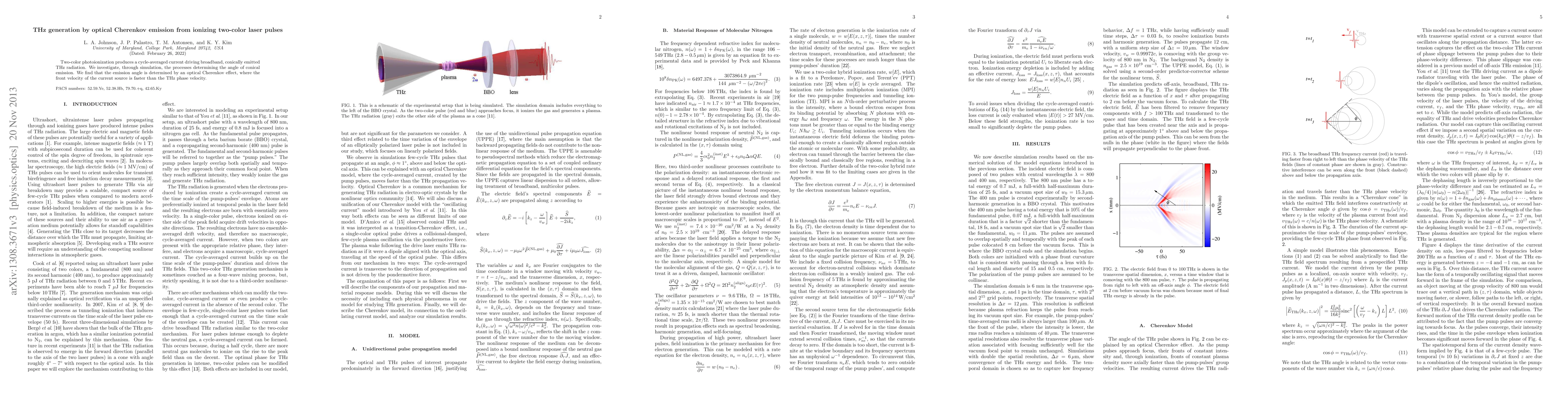 Summary: This research explores the generation of terahertz (THz) radiation via optical Cherenkov emission from two-color laser pulses, revealing that the emission angle is governed by the optical Cherenkov effect, where the current source's velocity exceeds the THz phase velocity. Simulation results elucidate the underlying mechanisms.