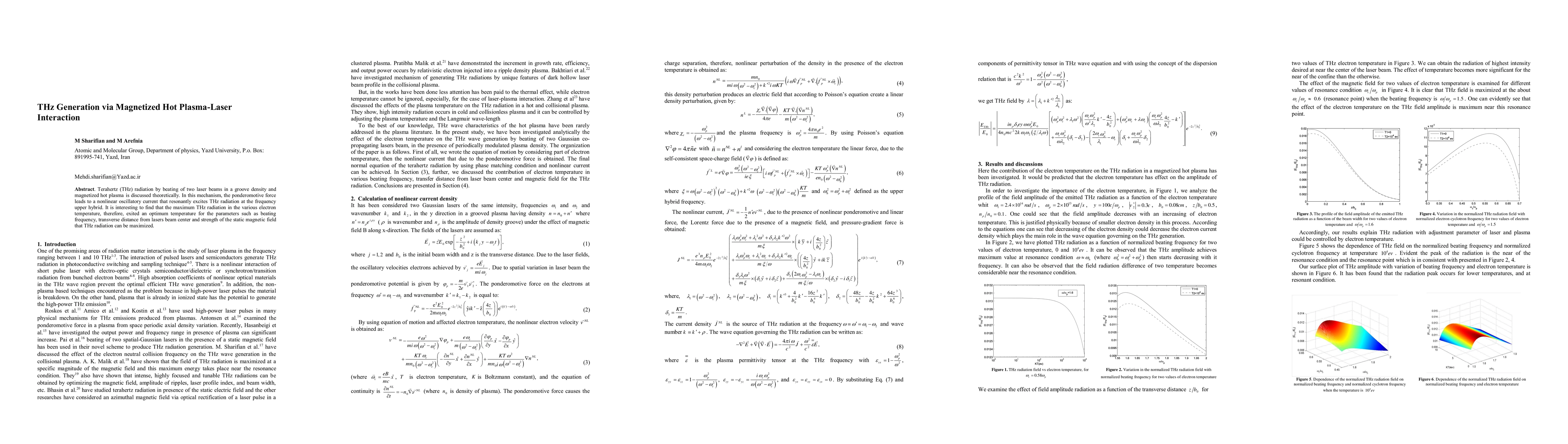 This paper theoretically explores THz generation through the interaction of two laser beams with a magnetized hot plasma, where the ponderomotive force induces a nonlinear current that excites THz radiation at the upper hybrid frequency. The study identifies an optimal electron temperature that maximizes THz radiation output based on parameters like beating frequency and magnetic field strength.