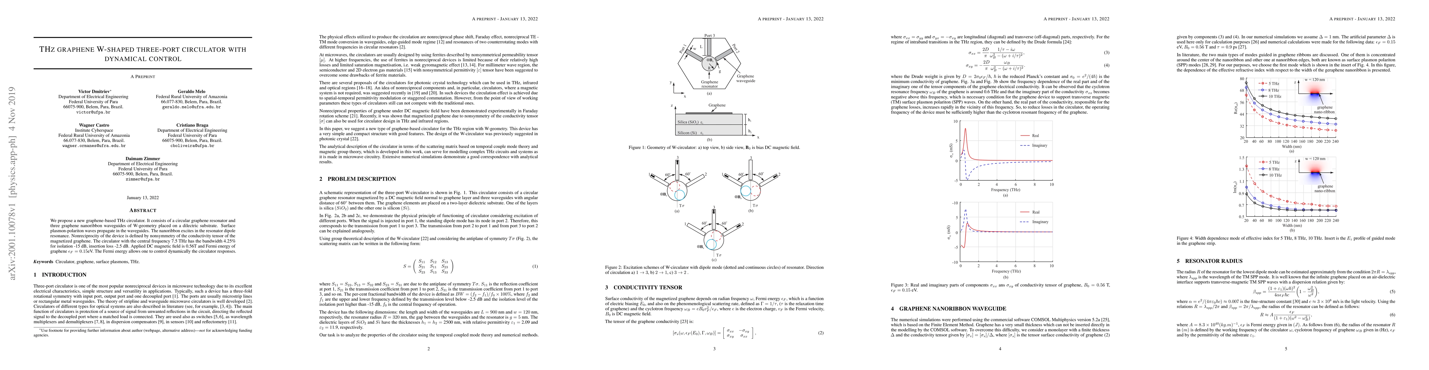 This paper proposes a THz graphene-based circulator utilizing W-shaped graphene nanoribbon waveguides, with nonreciprocity controlled by the magnetized graphene's conductivity tensor. The device's central frequency is 7.5 THz, with dynamic control via the Fermi energy.